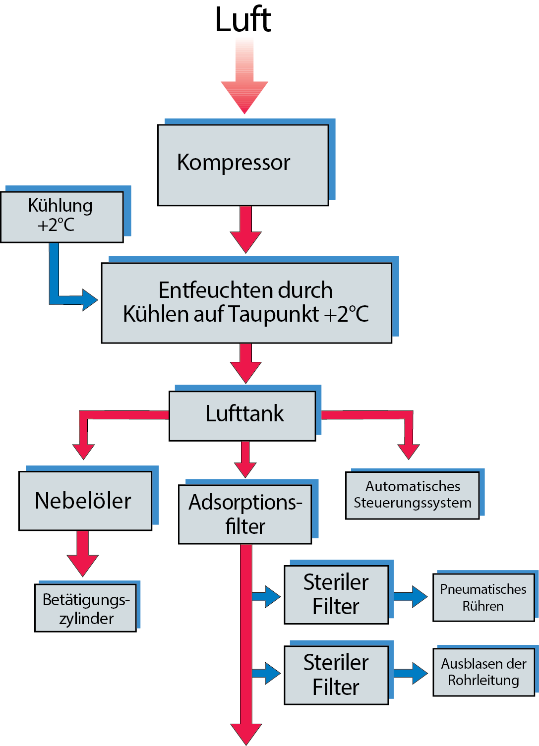 Druckluft höchster Qualität, die in direkten Kontakt mit dem Produkt gelangt, z. B. bei pneumatischen Rührwerken in Tanks oder beim Entleeren von Produktleitungen, wird vor der Verwendung in Adsorptionsfiltern weiter getrocknet und anschließend mittels spezieller Filter sterilisiert.