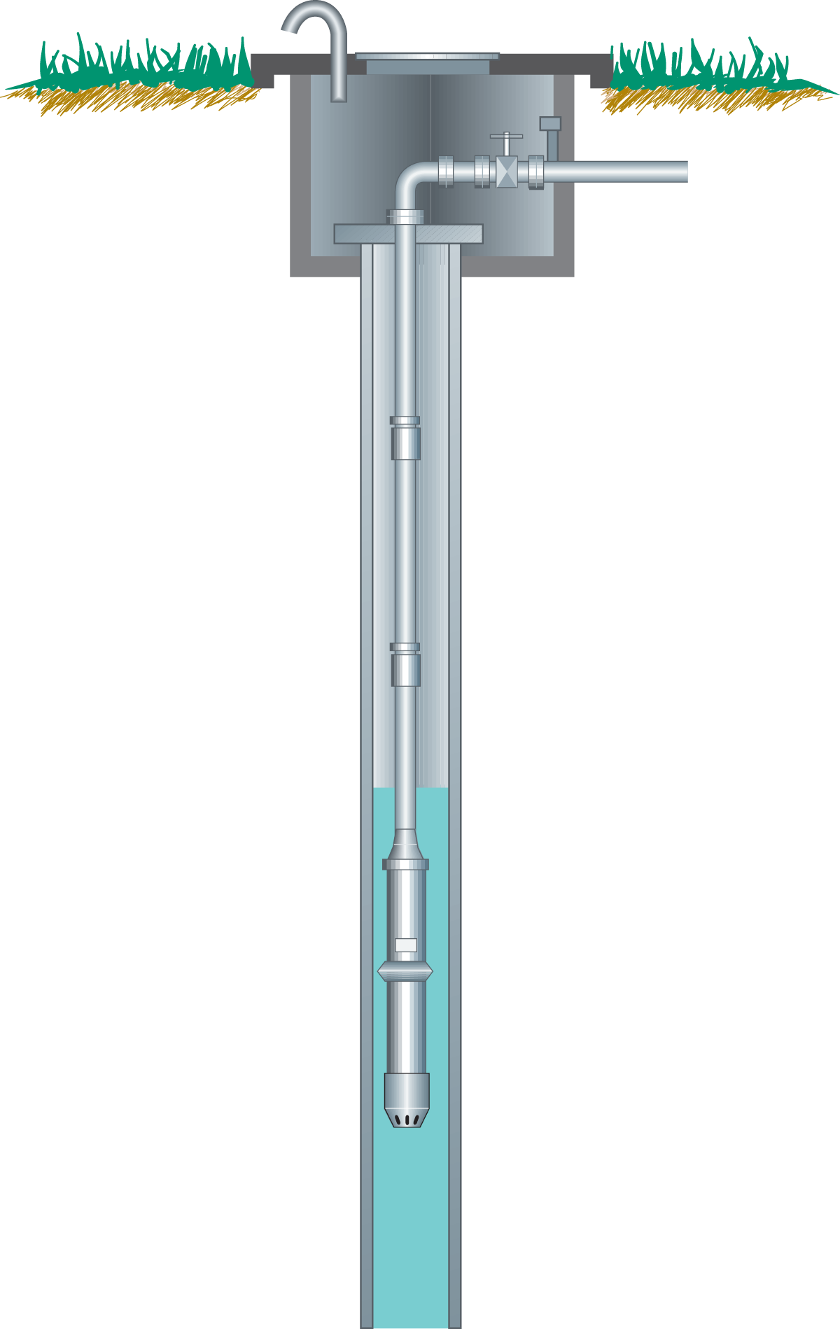 Viele Molkereien verfügen über eigene Brunnen. Dort, wo das Grundwasser nahe an der Oberfläche liegt, wird ein Brunnenschacht gegraben. Befindet sich das Wasser tiefer (vgl. Abb. 6.11.2.), wird ein langes Rohr in den Boden getrieben. Das Wasser wird über eine Pumpe nach oben gefördert, meist über eine Tauchpumpe, und in einem Reservoir gespeichert, i. d. R. auf Bodenhöhe, zuweilen aber auch auf größerer Höhe (Wasserturm). Von dort geht es über eine Pumpe oder durch Schwerkraft an die verschiedenen Verbrauchsstellen in der Molkerei.