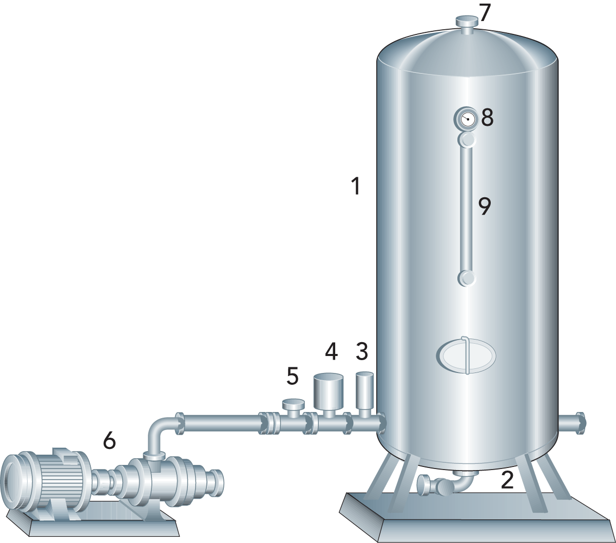 Zum Beispiel könnte eine Molkerei ihre Produktion steigern, ohne dass gleichzeitig ihre Wasserversorgung angepasst wird. Erfolgen dann mehrere plötzliche Verbrauchsspitzen zugleich, kann der Wasserdruck auf ein für den ordnungsgemäßen Betrieb bestimmter Anlagen gefährlich niedriges Niveau absinken. Dies kann durch einen Drucktank verhindert werden. Der Drucktank fungiert dabei als Speicher. Das gängige Volumen eines Wassertanks beträgt 1 bis 3 m3. Wasser wird darin durch ein Luftpolster auf einem festgelegten Druck gehalten. Der Drucktank versorgt die jeweilige Anlage bei entsprechendem Druck mit der geforderten Wassermenge. Wird kein weiteres Wasser benötigt, speichert der Tank Wasser in Vorbereitung auf den nächsten Verbrauch. Abb. 6.11.3 zeigt einen solchen Drucktank. In Zeiten, in denen kein Wasser benötigt wird, füllt sich der Tank bis zum voreingestellten Füllstand. Ein Druckschalter (4) schaltet die Energiezufuhr zur Pumpe ab (6). Wird Wasser aus dem Tank gezogen, wird der damit verbundene Druckabfall vom Druckschalter registriert, der über eine elektrische Schaltung (Schütz) eine Pumpe startet, die dann wieder Wasser in den Tank nachfördert. Wenn die Wasserabnahme beendet ist, steigt der Wasserspiegel im Tank bis zum Erreichen des voreingestellten Drucks. Der Druckschalter stoppt die Pumpe, und der Drucktank ist bereit für die nächste Entnahme.