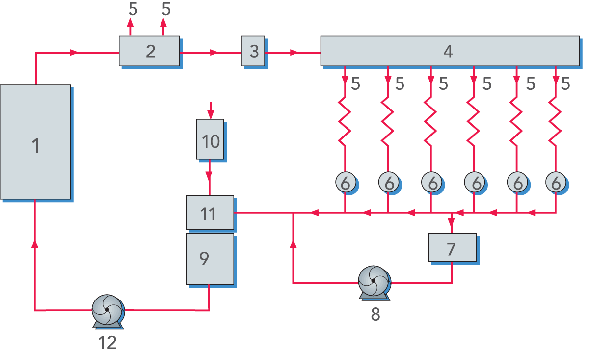 Abb. 6.11.7 zeigt das Schema einer Dampfverteilung und Kondensatsammlung. Der Dampf strömt über das Hauptabsperrventil im Dampfdom durch ein Druckreduzierventil zum Dampfverteiler. Von dort gelangt der Dampf zu den verschiedenen Verbrauchsstellen. Häufig wird vor den Verbrauchsstellen zur Feineinstellung des Dampfdrucks ein weiteres Druckreduzierventil eingebaut.