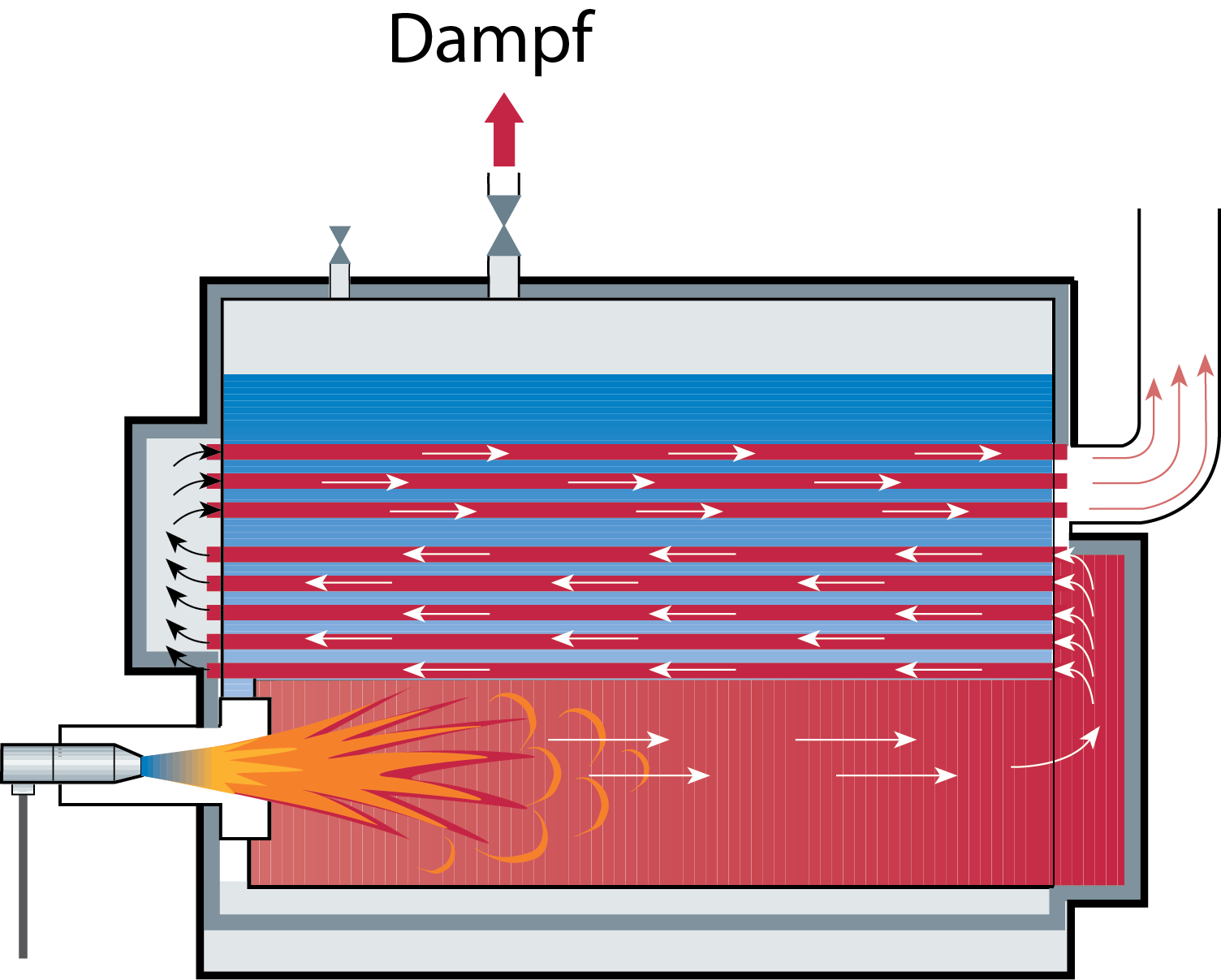 Abb. 6.11.5 zeigt den Aufbau des Flammrohrkessels. Die heißen Rauchgase werden über einen Ventilator durch die Rohre geleitet. Wärme aus den Rauchgasen wird über die Rohrwände in das die Rohre umgebende Wasser geleitet. Das Wasser wird bis zur Siedetemperatur erhitzt. Der Dampf wird für die Verteilung im System im Dampfdom gesammelt.