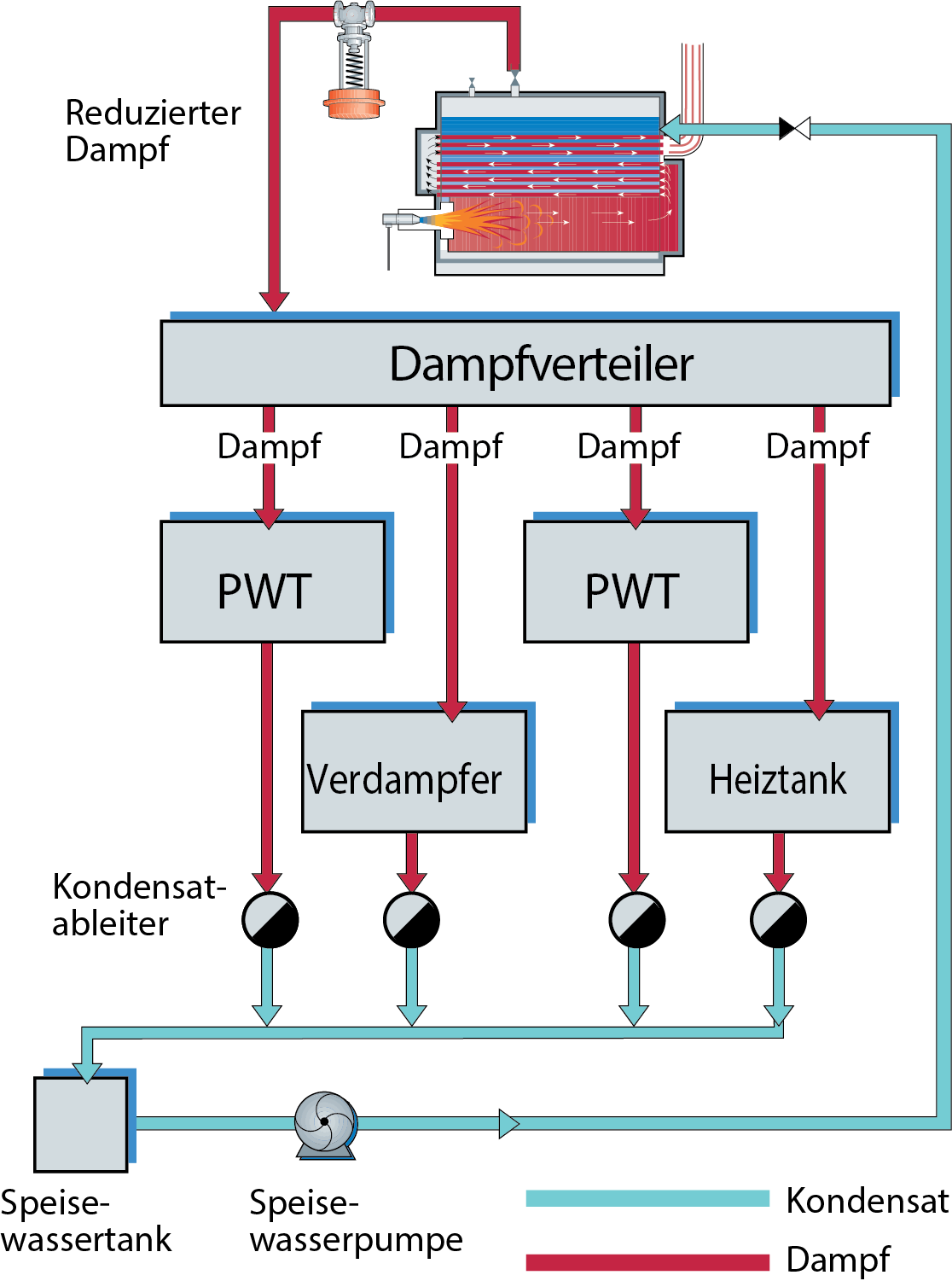 Hier sind Kondensatableiter installiert. Sie lassen Kondensat (und vorzugsweise auch Luft) durch, nicht aber Dampf. Das Kondensat wird an den einzelnen Dampfverbrauchsstellen ebenfalls auf diese Weise aufgefangen und über Kondensatpumpen und Kondensatleitungen in einen Sammeltank in das Heizwerk zurückgefördert. Das Kondensat kann auch ohne Kondensattank oder -pumpen über Dampfdruck in das Speisewasser rückgeleitet werden. Auch dieses Konzept wird häufig verwendet.