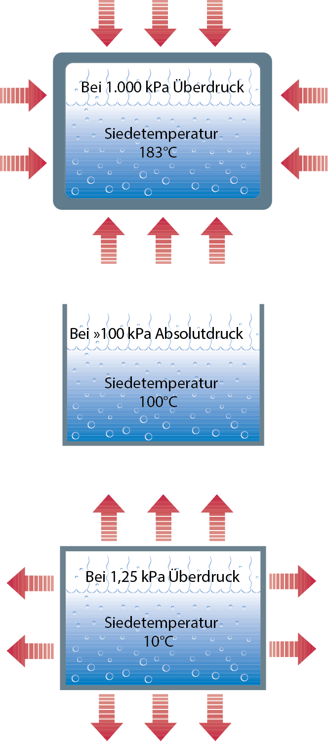 Umgekehrt kocht Wasser bei reduziertem Druck bereits bei einer niedrigeren Temperatur. Wasser kocht unter Atmosphärendruck bei 100 °C, vgl. Abb. 6.11.8 (B). Wird der Druck unter den Atmosphärendruck gesenkt, bildet sich ein Vakuum und Wasser kocht bereits unterhalb einer Temperatur von 100 °C. Wasser kann bei ca. 80 °C zum Kochen gebracht werden, wenn eine an den Behälter angeschlossene Vakuumpumpe den Absolutdruck auf 50 kPa (0,5 bar) senkt. Sinkt der Druck auf 1,25 kPa (0,0125 bar), kocht Wasser bei 10 °C, vgl. Abb. 6.11.8 (C).