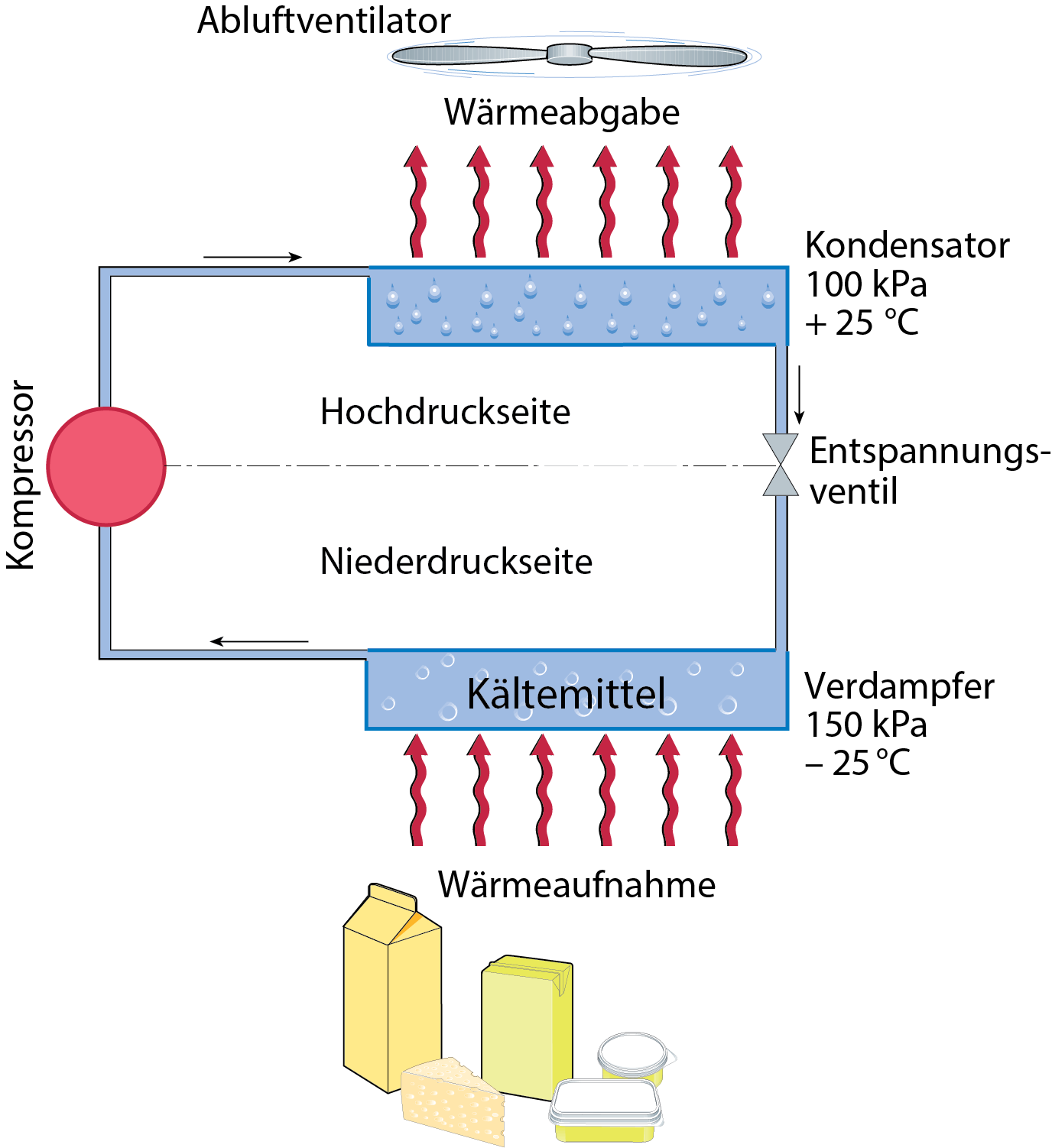 Ein Kältesystem ist ein geschlossener Kreislauf, in dem das Kältemittel zwischen gasförmiger und flüssiger Phase wechselt, bei dem abwechselnd Druckentlastung (Expansion) und Druckphasen (Kompression) erfolgen.
