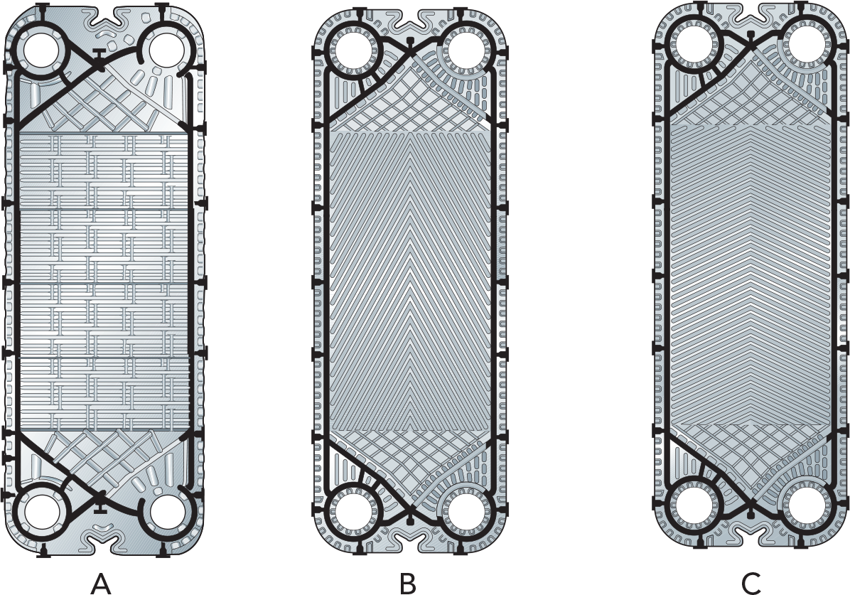 Für eine wirksame Wärmeübertragung sollten die Kanäle zwischen den Platten so schmal wie möglich sein. Fließgeschwindigkeit und Druckverlust nehmen jedoch erheblich zu, wenn eine große Produktmenge durch diese engen Kanäle gefördert wird. Da normalerweise weder hoher Druckverlust noch hohe Strömungsgeschwindigkeit erwünscht sind, wird der Produktstrom i. d. R. auf mehrere parallele Kanäle verteilt.