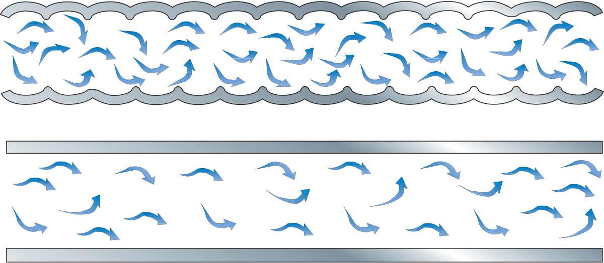 Bei der Laminarströmung in geraden Rohren wird die Wärmeübertragung auf die Flüssigkeit lediglich durch die Wärmeleitung in der Flüssigkeit aufrechterhalten. Daher ist dort die Effizienz der Wärmeübertragung geringer als bei der turbulenten Strömung, bei der eine intensive Durchmischung senkrecht zur Fließrichtung stattfindet, wodurch sich der Wärmeübergang stark erhöht.