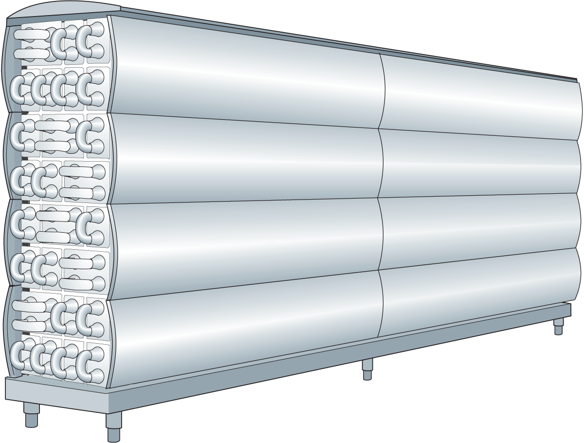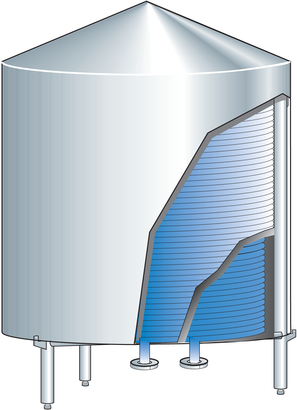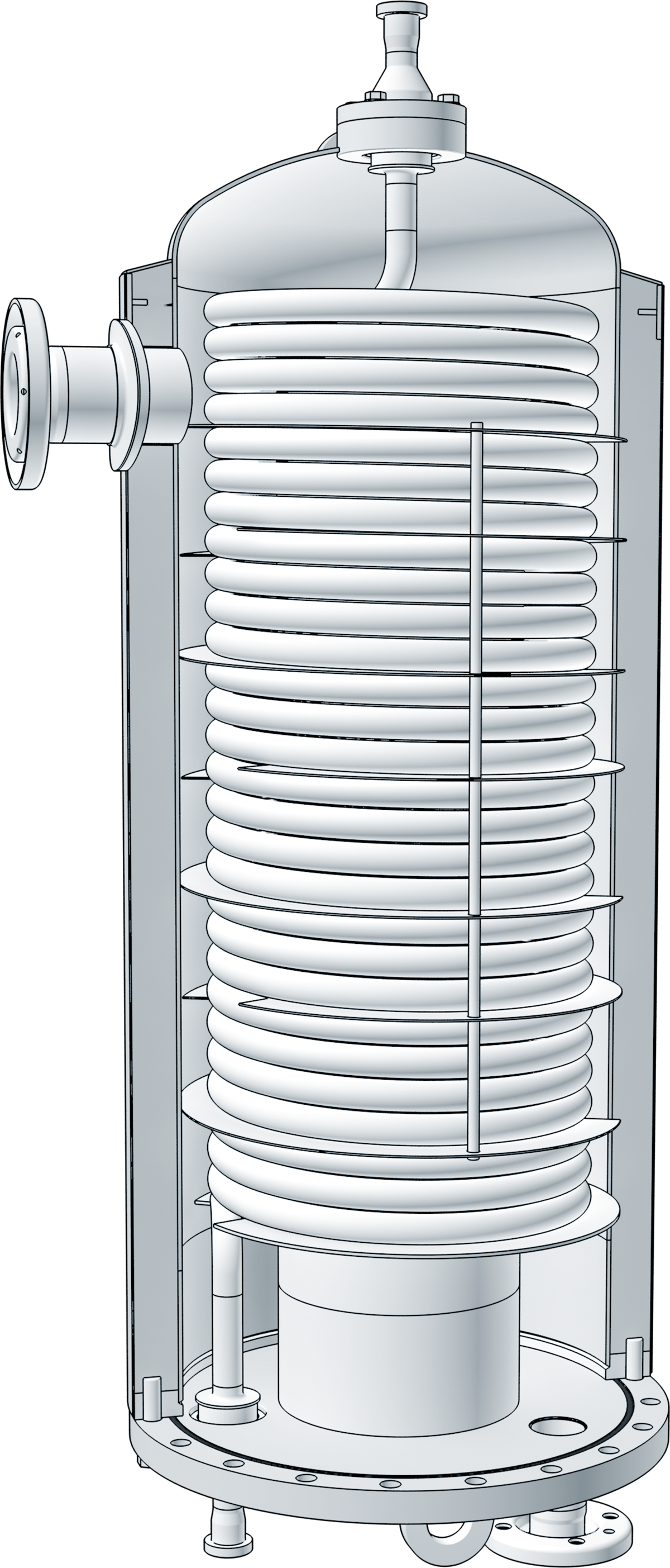 Das gewendelte Produktrohr liegt in einer vertikalen Kammer, durch die das Heiz- oder Kühlmedium strömt. Die unteren und oberen Produktrohranschlüsse sind durch O-Ringe in der Behälterkonstruktion für das Medium beweglich gelagert. Bei dieser Ausführung werden thermische Ausdehnungen absorbiert und so Rissbildungen vorgebeugt. Das Element wird mit einer Isolierung geliefert, um Wärmeverluste zu minimieren und die Sicherheit des Bedienpersonals zu gewährleisten. Die Auswahl der Größe des Wärmetauschers richtet sich nach dem jeweiligen speziellen Anwendungsfall – die Anzahl der Elemente hängt von der gewünschten Kapazität und der erforderlichen Wärmeübertragungsfläche ab.
