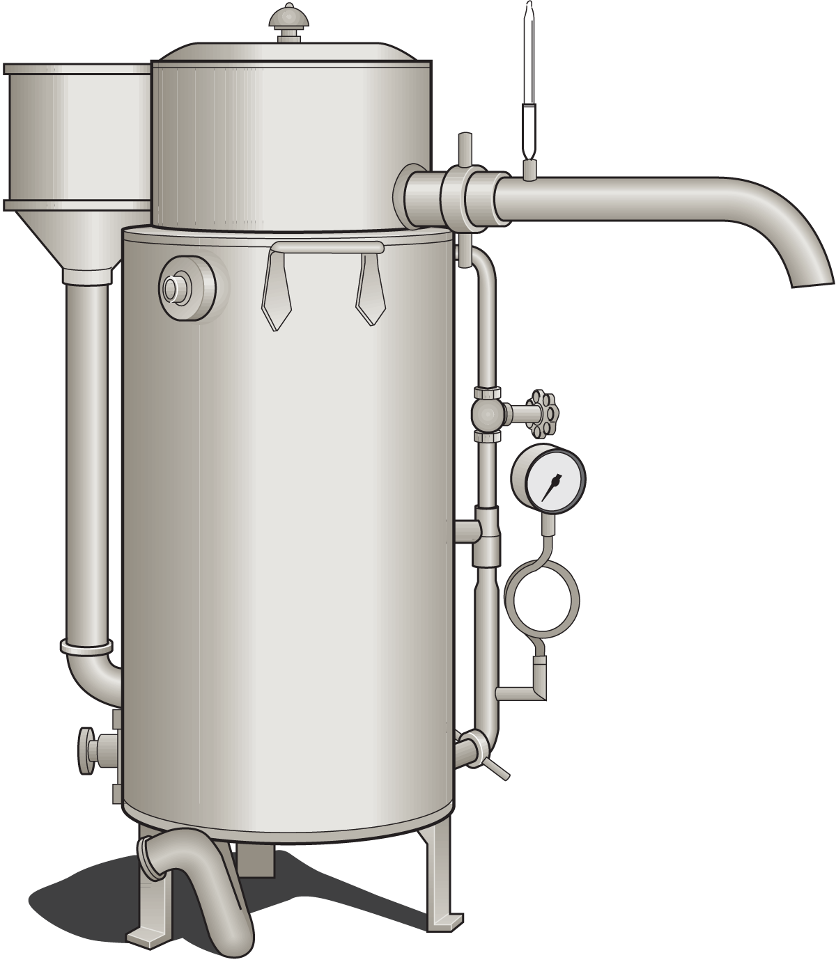 Bis Ende des 19. Jahrhunderts war der Erhitzer als heiz- und kühlbarer Behälter mit Rührwerk das am weitesten verbreitete Gerät. Ein Beispiel wird in Abb. 6.1.14 gezeigt. Trotz vieler Nachteile waren diese Wärmetauschermodelle in einigen Molkereien bis in die 50er Jahre des 20. Jahrhunderts noch im Einsatz.