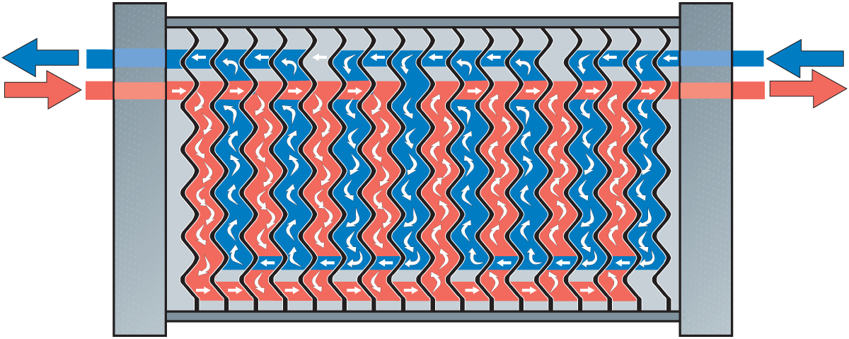 Verglichen mit einem Plattenwärmetauscher ist jedoch eine höhere Strömungsgeschwindigkeit notwendig, um eine effiziente Wärmeübertragung zu erreichen.