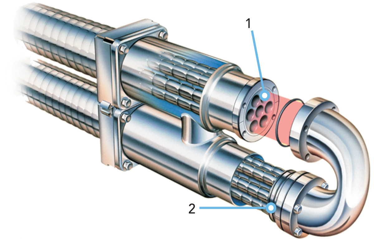 Das „Floating Protection System" absorbiert die thermische Ausdehnung. Die Produktrohrbündel im Mantel können ausgetauscht werden und erlauben verschiedene Kombinationen für unterschiedliche Anwendungen.