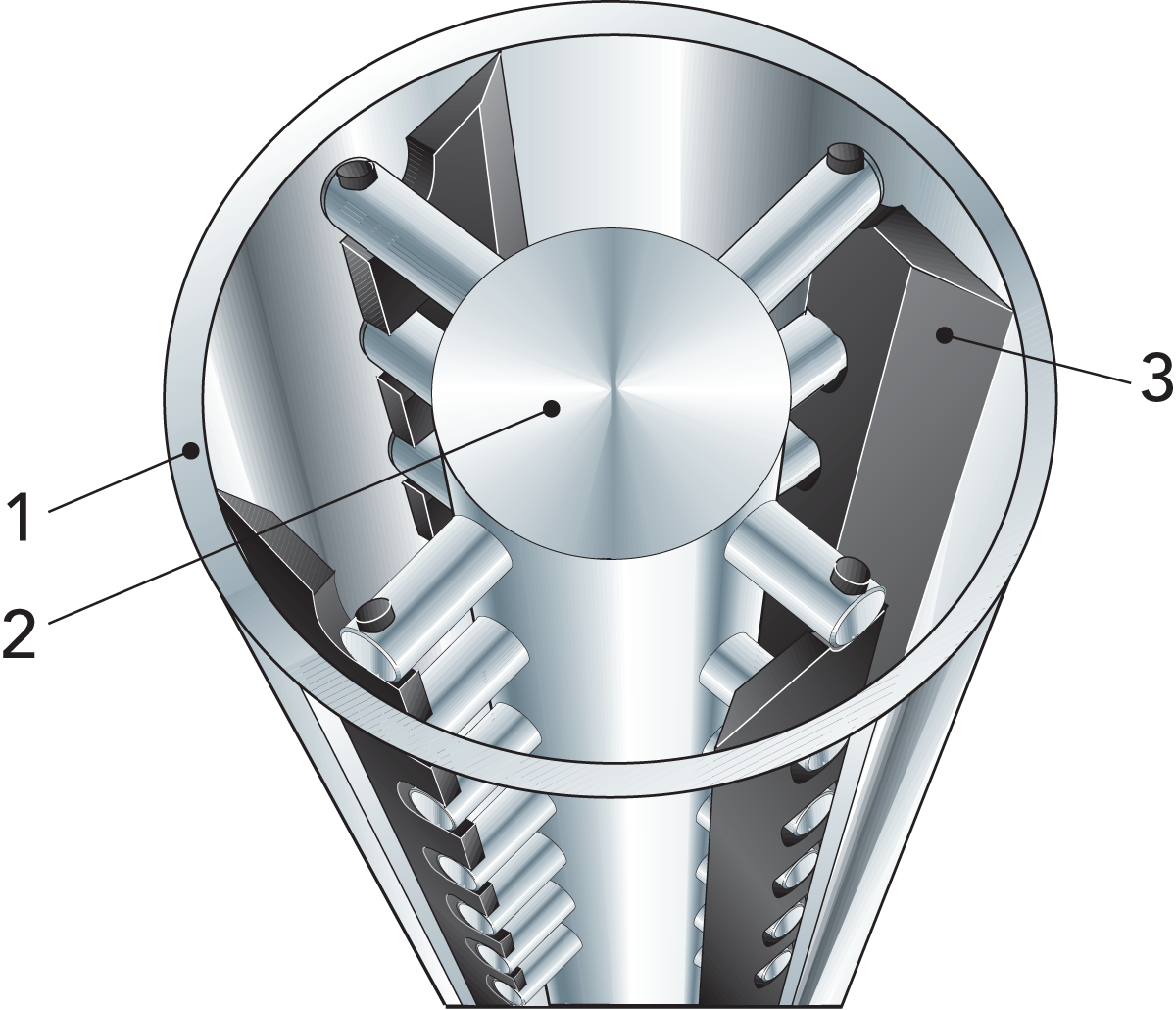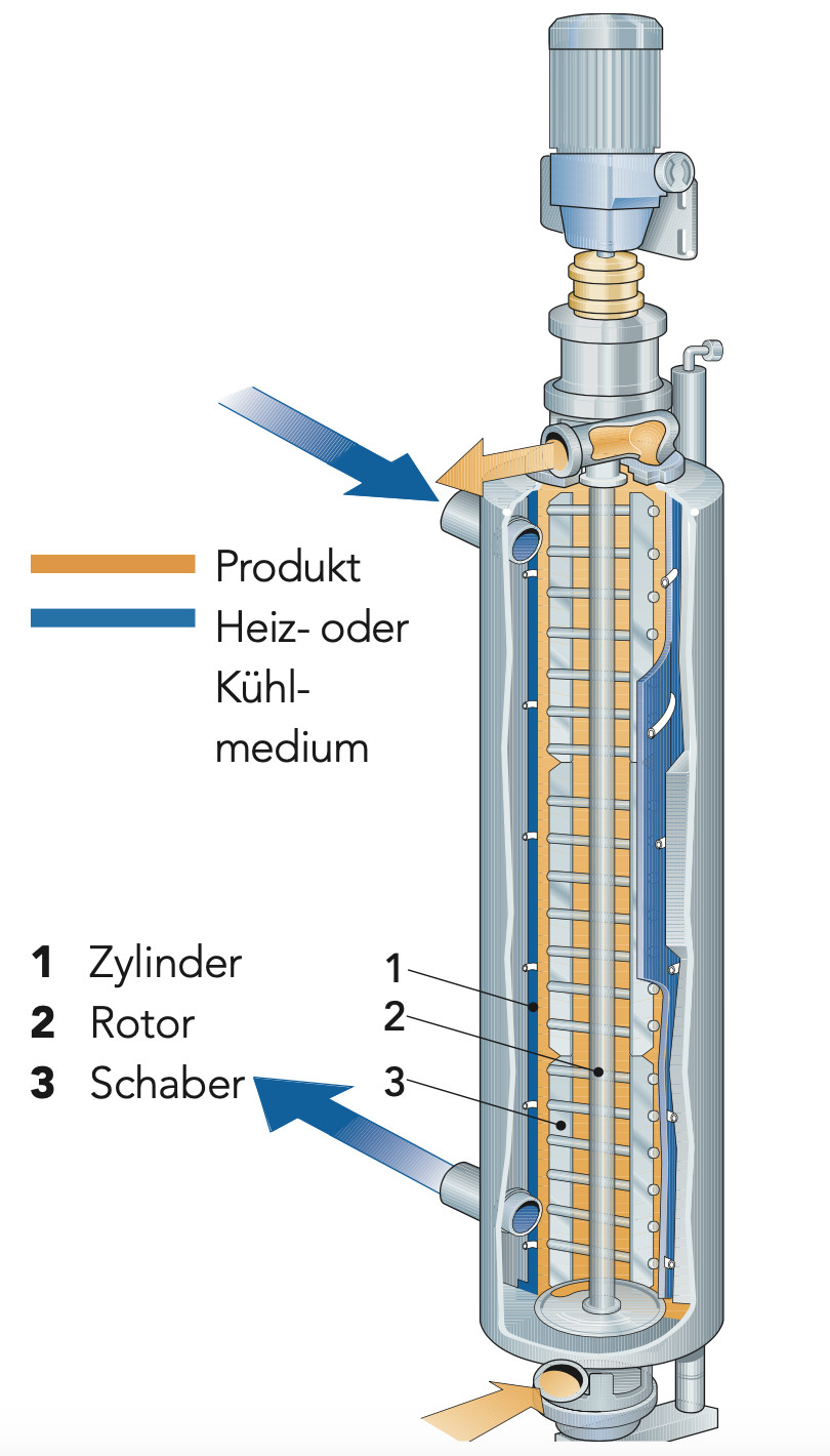 Die rotierenden Schaber entfernen das Produkt laufend von der Zylinderwandung (Abb. 6.1.23), um eine gleichmäßige Wärme- oder Kälteübertragung auf das Produkt zu gewährleisten. Zudem bleibt die Oberfläche frei von Ablagerungen. Das Produkt verlässt den Zylinder durch den oberen Anschluss. Produktstrom und Rotorgeschwindigkeit sind variabel, um den Eigenschaften der durch den Zylinder strömenden Produkten gerecht zu werden.