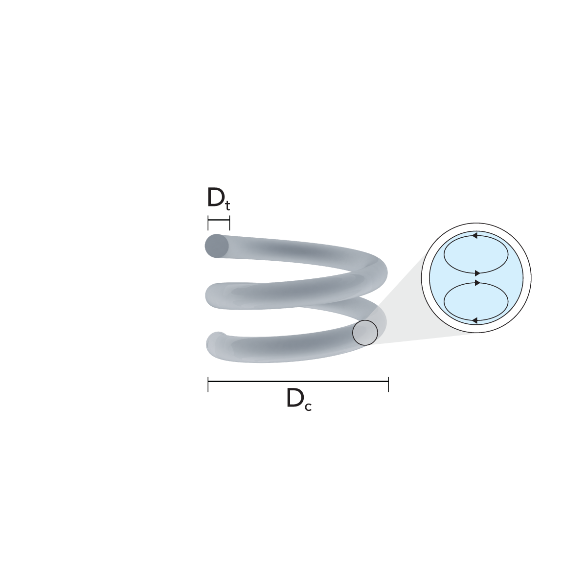 Bei einem Spiralrohrwärmetauscher fließt das Produkt durch ein gewendeltes Rohr und das Medium umströmt das Produktrohr, um das Produkt zu erwärmen oder abzukühlen. Die einzigartige Besonderheit der gewickelten Ausführung besteht darin, dass mit ihr eine Sekundärströmung von hoher Geschwindigkeit senkrecht zum Produktstrom erzeugt wird, was die Effizienz der Wärmeübertragung erheblich erhöht. Diese Sekundärströmung wird als „Dean-Effekt" bezeichnet.