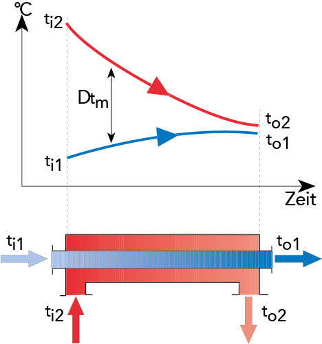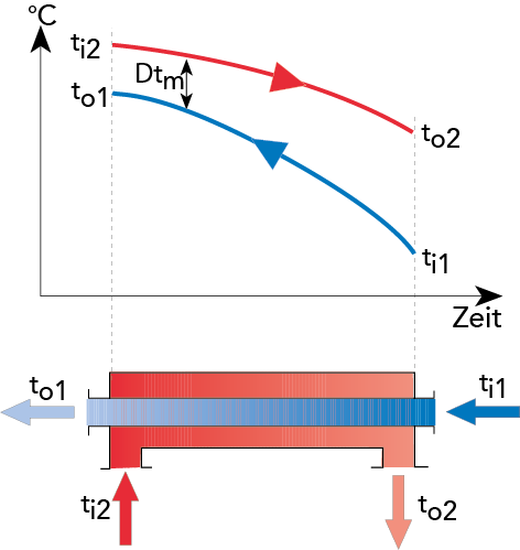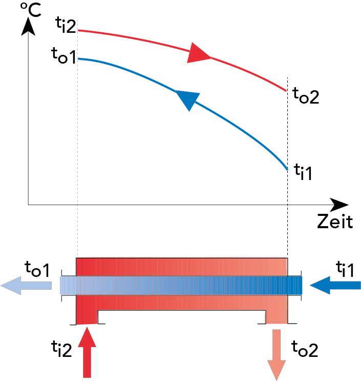 Heißwasser (rot) strömt durch einen Kanal und Milch (blau) durch den anderen. Wärme wird durch die Abtrennung hindurch übertragen. Das Heißwasser strömt mit einer Temperatur von ti2 ein und wird bis zum Austritt auf t02 gekühlt. Milch strömt mit ti1 ein und wird durch das Heißwasser bis zum Austritt auf t01 erhitzt. Die Temperatur ändert sich während des Durchströmens des Wärmetauschers, wie die Kurven in Abb. 6.1.7 zeigen.