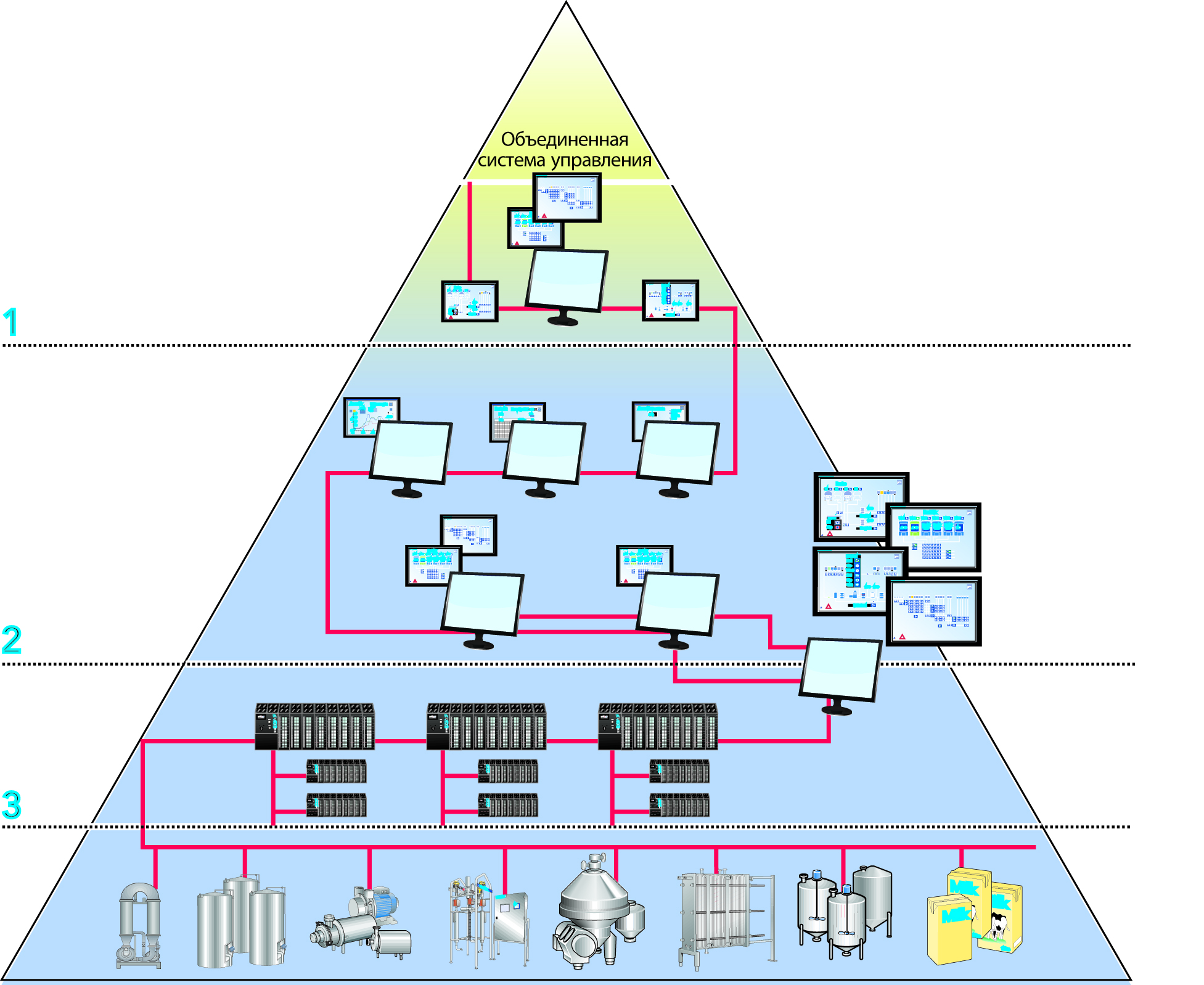 Предприятие состоит из более чем одной технологической площадки, например зоны приемки, производства сыра и питьевого молока. У каждой площадки своя конфигурация одного или нескольких устройств управления процессом, и зачастую у них есть пользовательский интерфейс для операторов, отвечающих за передачу продукта из одной технологической площадки в другую.
