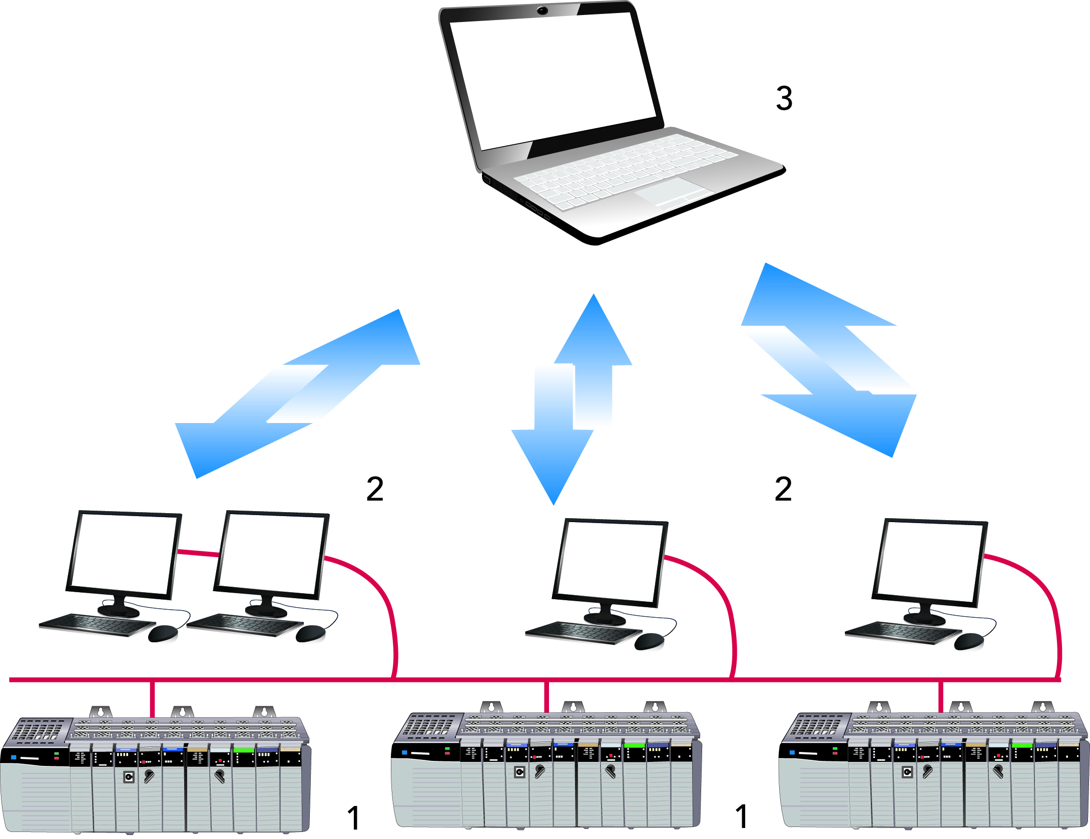 Оператор контролирует предприятие или линию, используя один или несколько интерфейсов пользователя. Технологические блоки с их собственными пультами управления в рабочем режиме управляются с центрального интерфейса пользователя. Координация технологических маршрутов и работы блоков осуществляется при помощи одного или нескольких программно- логических контроллеров (PLC) предприятия.