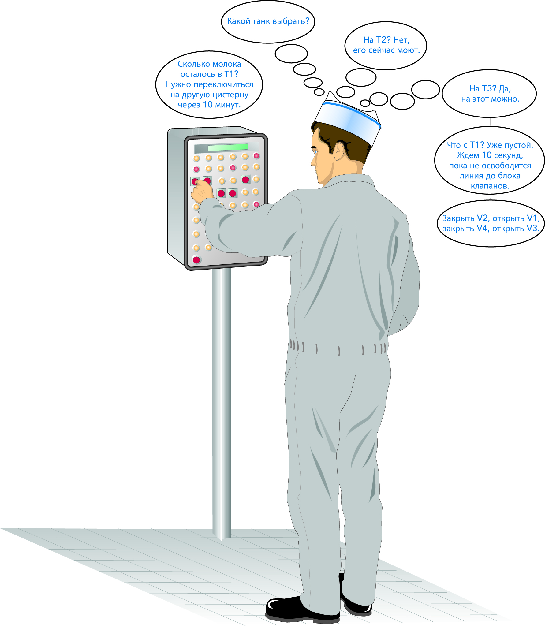 Оператор не испытывает особых трудностей при решении данной задачи управления. Но даже в этом случае не исключена вероятность ошибки. По ошибке моющий раствор и молоко могут перемешаться. В линии переработки может закончиться молоко, что приведет к появлению нагара на теплопередающих поверхностях. Молоко, оставшееся в танке во время его мойки, будет потеряно. Риск таких ошибок возрастает, если оператор одновременно отвечает за несколько подобных участков производства. Его могут торопить, у него может быть стресс, что повышает риск совершения ошибки.