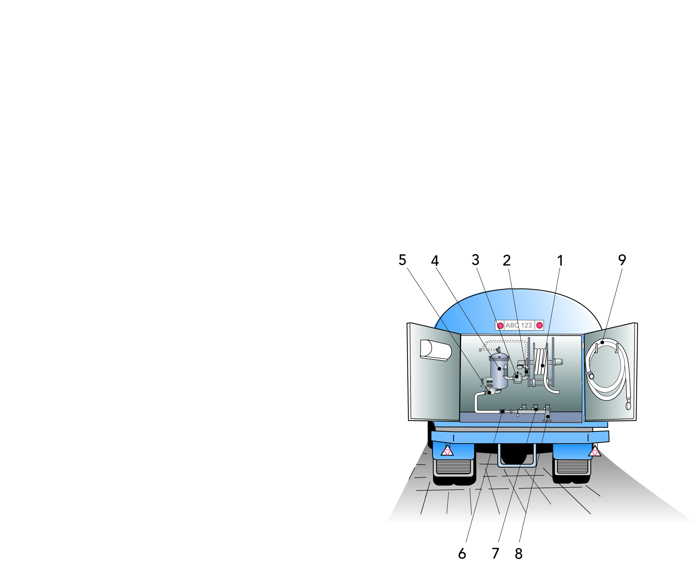 Вместе с повышением уровня молока в деаэраторе поднимается и находящийся в нем поплавок, на определенном уровне поплавок закрывает клапан в верхней части сосуда. Давление в сосуде повышается, вследствие чего срабатывает обратный клапан (6). Молоко проходит через счетчик (5) и блок клапанов (7) в баки цистерны. Слив из цистерны происходит через отверстие (8) с помощью шланга (9).