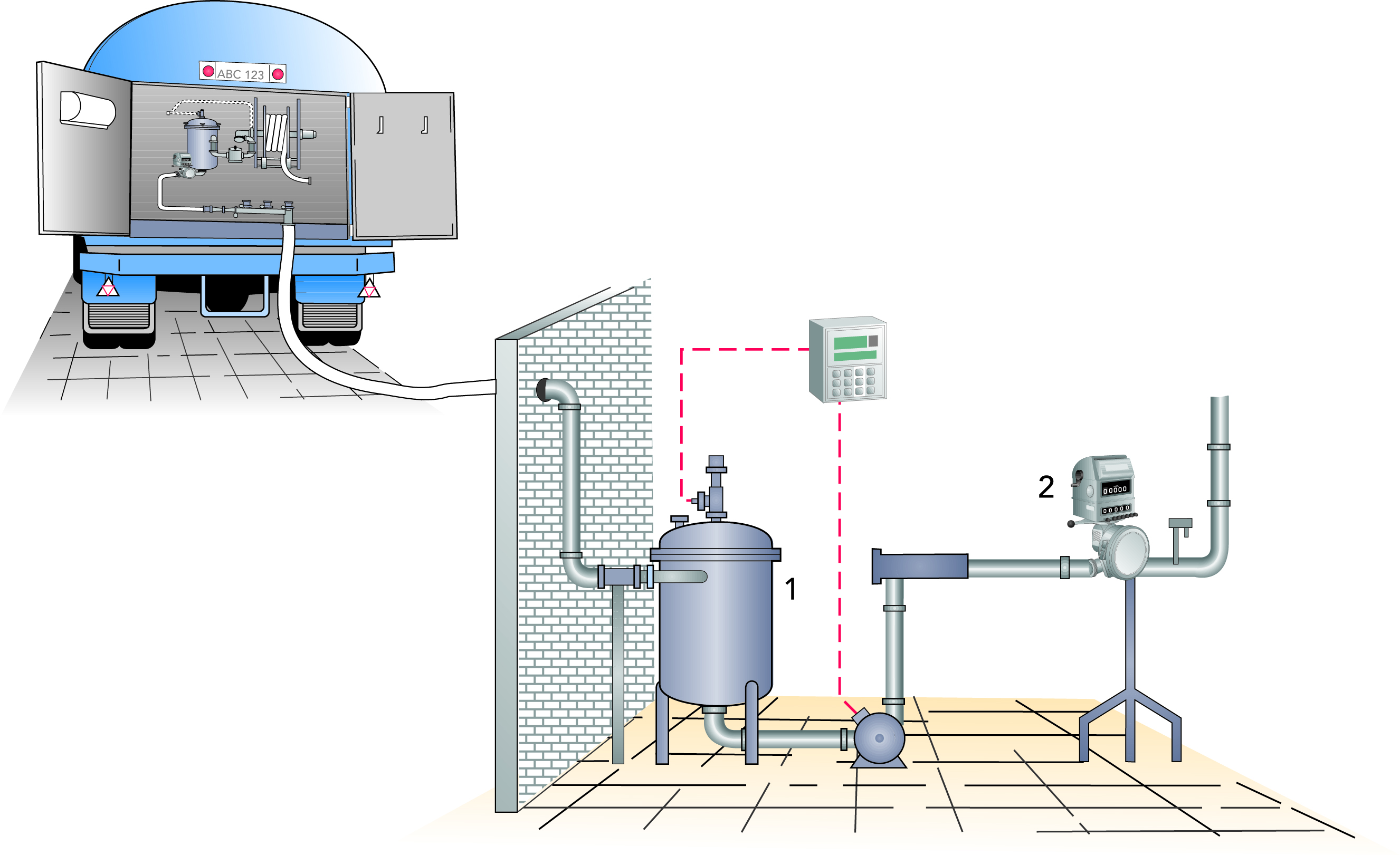 Заборный шланг (1) соединен с фермерской флягой и/или танком для охлаждения молока. Молоко проходит сквозь фильтр (2) и закачивается в деаэратор (4). Объемный насос (3) является самовсасывающим.