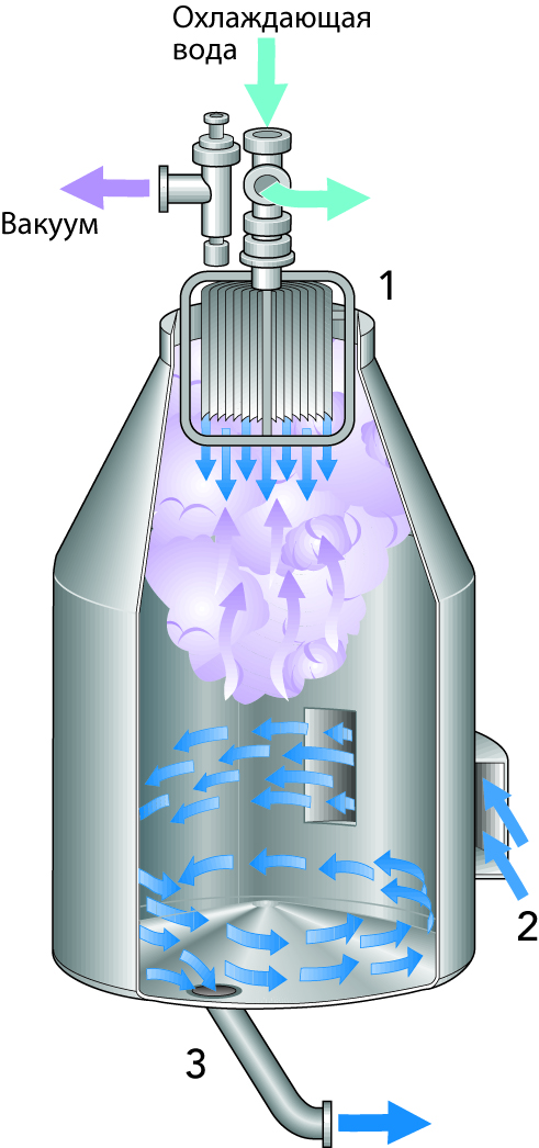 Пар проходит встроенный в сосуд конденсатор, конденсируется и возвращается в молоко, в то время как воздух вместе с неконденсирующимися газами (некоторые неприятные запахи) удаляется из сосуда вакуумным насосом.