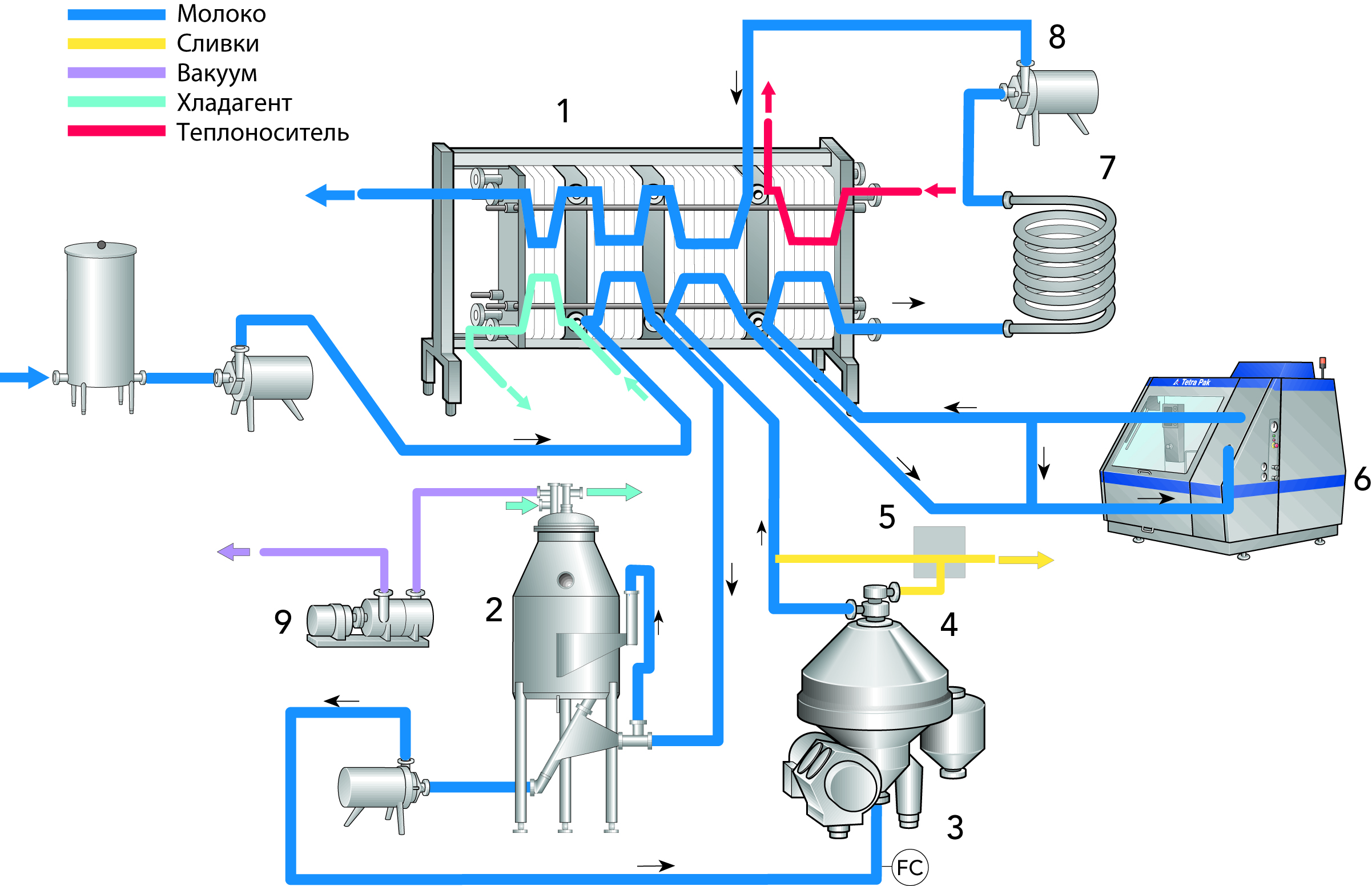 Цельное молоко поступает в пастеризатор, где оно нагревается до 68 °С. Затем оно следует в расширительный сосуд для вакуумной обработки. Для оптимизации процесса молоко поступает в вакуумную камеру по касательной через широкое отверстие, что позволяет ему распределиться тонким слоем по стенке сосуда. Расширение пара, испаряющегося из молока при входе в сосуд, ускоряет движение потока молока вниз по стенке.