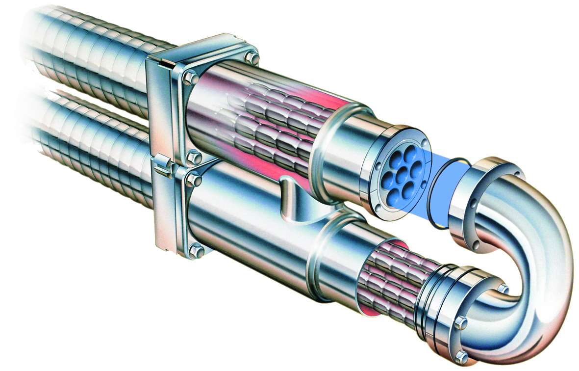 Трубчатый теплообменник состоит из большого числа труб, собранных в модули, которые могут быть соединены последовательно и/или параллельно, образуя полностью оптимизированную систему для любого режима нагрева или охлаждения, которая может быть также снабжена системой многоконтурного нагрева.