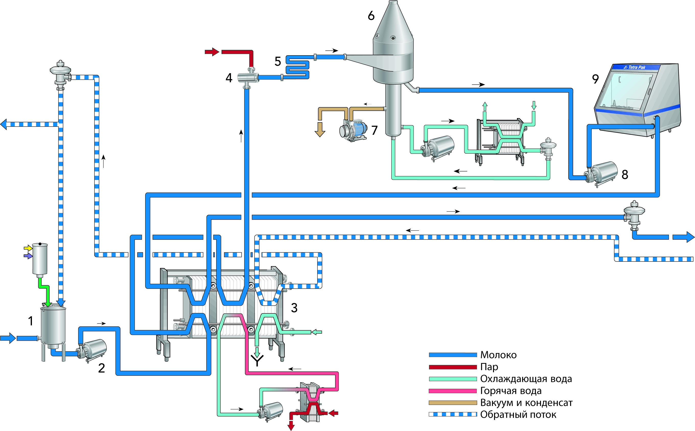 Инжекция пара (4) мгновенно повышаеттемпературу до 140–150 °С. Молоко выдерживается при этой температуре несколько секунд (5), а затем охлаждается. Впрыснутый пар мгновенно испаряется в вакуумной камере (6), в результате чего температура молока падает до 80 °С.