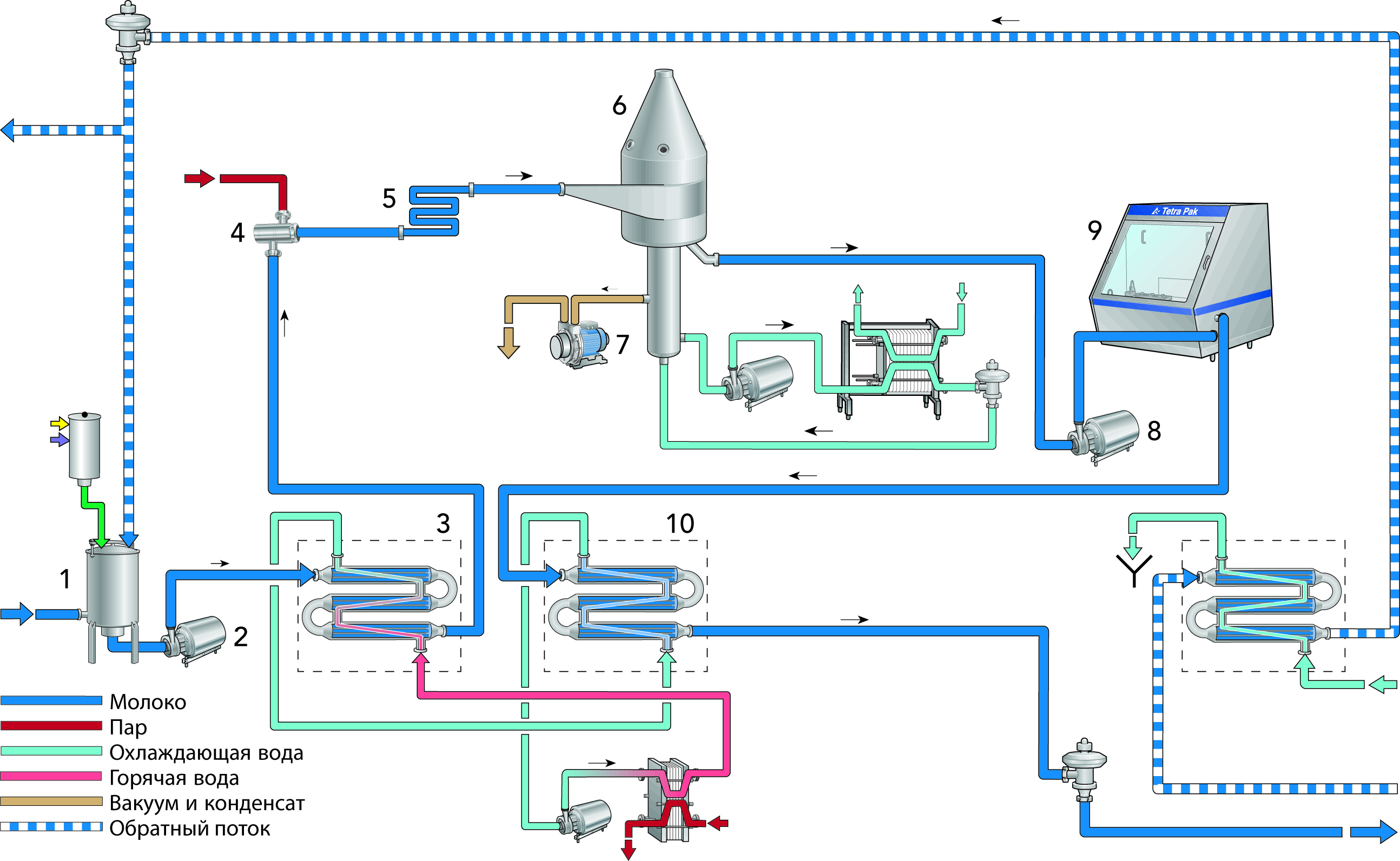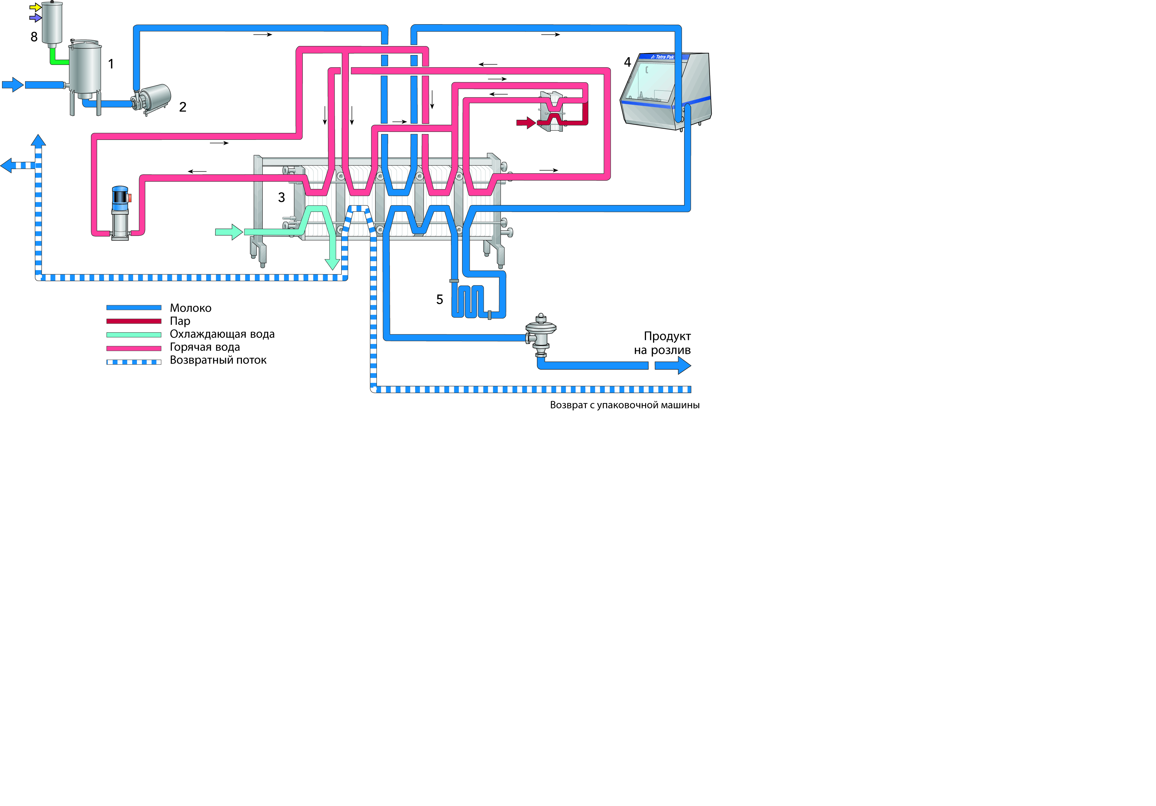 После предварительной стерилизации и охлаждения установки до 25 °С молоко при температуре 4 °С направляется в трубчатый теплообменник (3) для предварительного нагрева приблизительно до 80 °C.