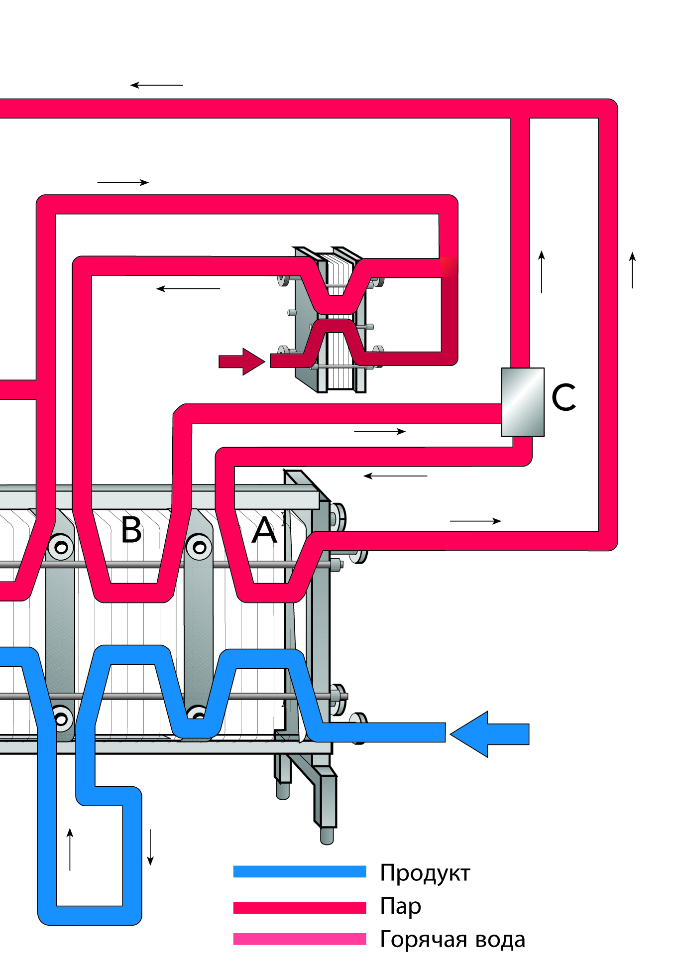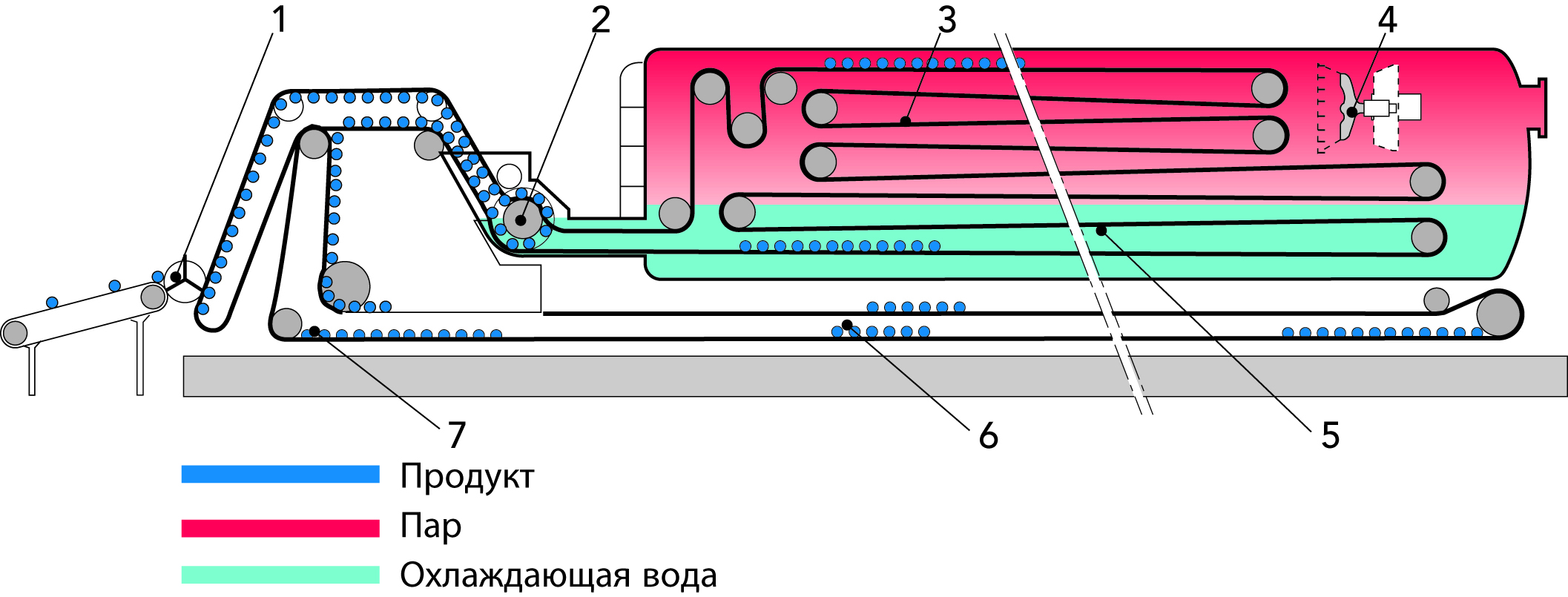 Продукт закачивается из балансного танка (1) насосом подачи (2) к первому скребковому теплообменнику (3). Дополнительные стадии нагревания (4) могут использоваться для доведения продукта до желаемой температуры. Контрольно-измерительные устройства, расположенные на различных стадиях процесса, контролируют достигнутые температуры.