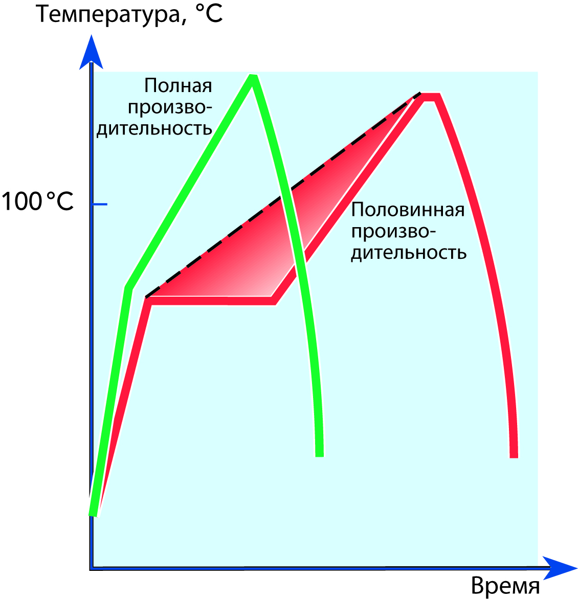 Кривые зависимости температуры от времени на рис. 9.19 показывают различие тепловой нагрузки на продукт при номинальной и 50-процентной производительности. Пунктирная линия на графике представляет изменение температуры в системе без разделения секции нагрева, работающей в режиме 50-процентной от номинальной производительности.