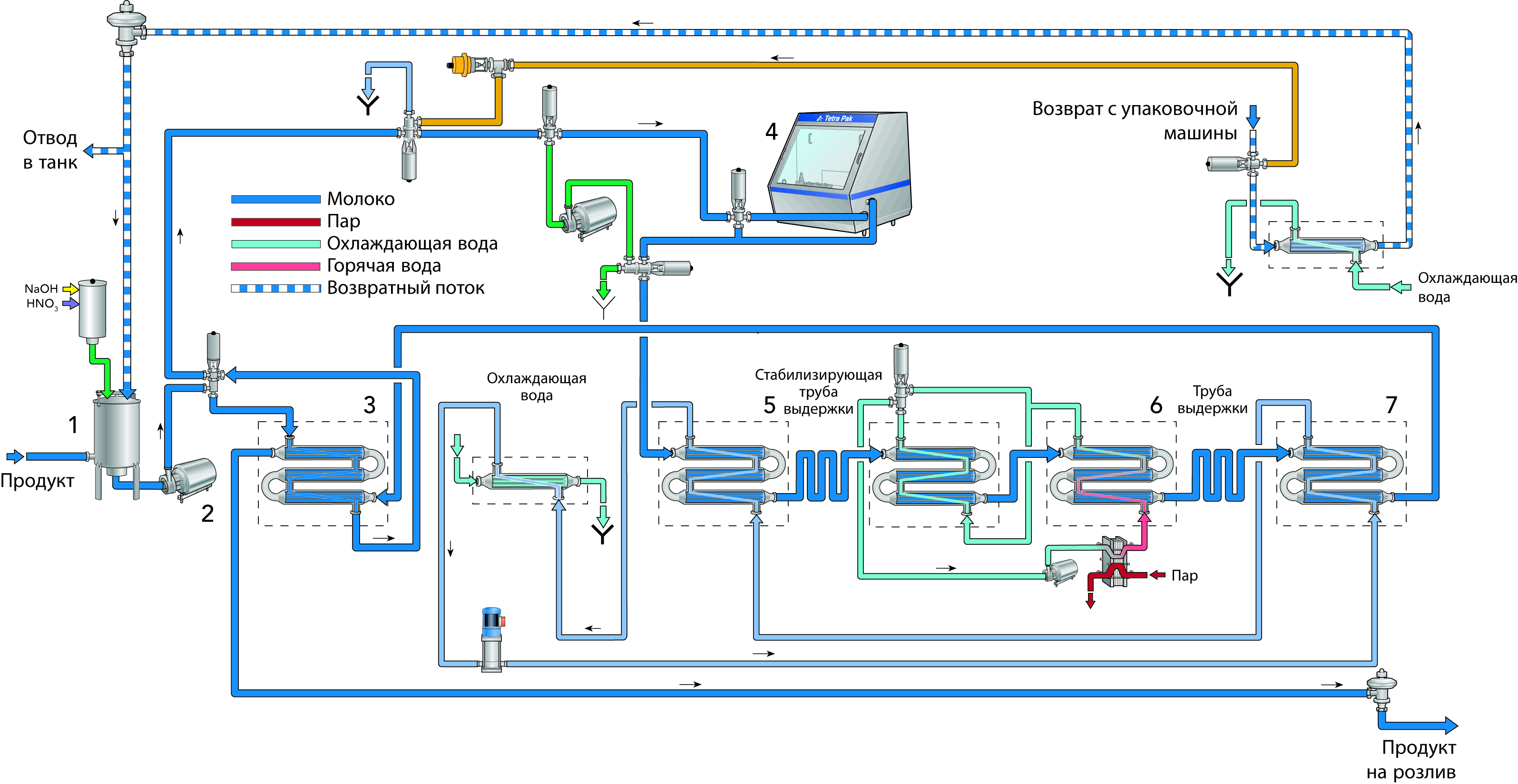 Продукт при температуре около 4 °С подают насосом из танка для хранения в балансный танк (1) установки для высокотемпературной обработки и далее насосом (2) в регенеративную секцию пластинчатоготеплообменника (3). Вэтой секции продукт нагревается до температуры приблизительно 75 °С уже прошедшим стерилизацию молоком, которое одновременно охлаждается. Предварительно нагретый продукт затем гомогенизируют (4) при давлении 18–25 МПа (180–250 бар). Гомогенизация перед обработкой методом UHT возможна в системах косвенного нагрева, это означает, что могут использоваться неасептические гомогенизаторы. Однако для улучшения структуры и физической устойчивости некоторых продуктов предпочтителен асептический гомогенизатор, установленный после секции высокотемпературной обработки.
