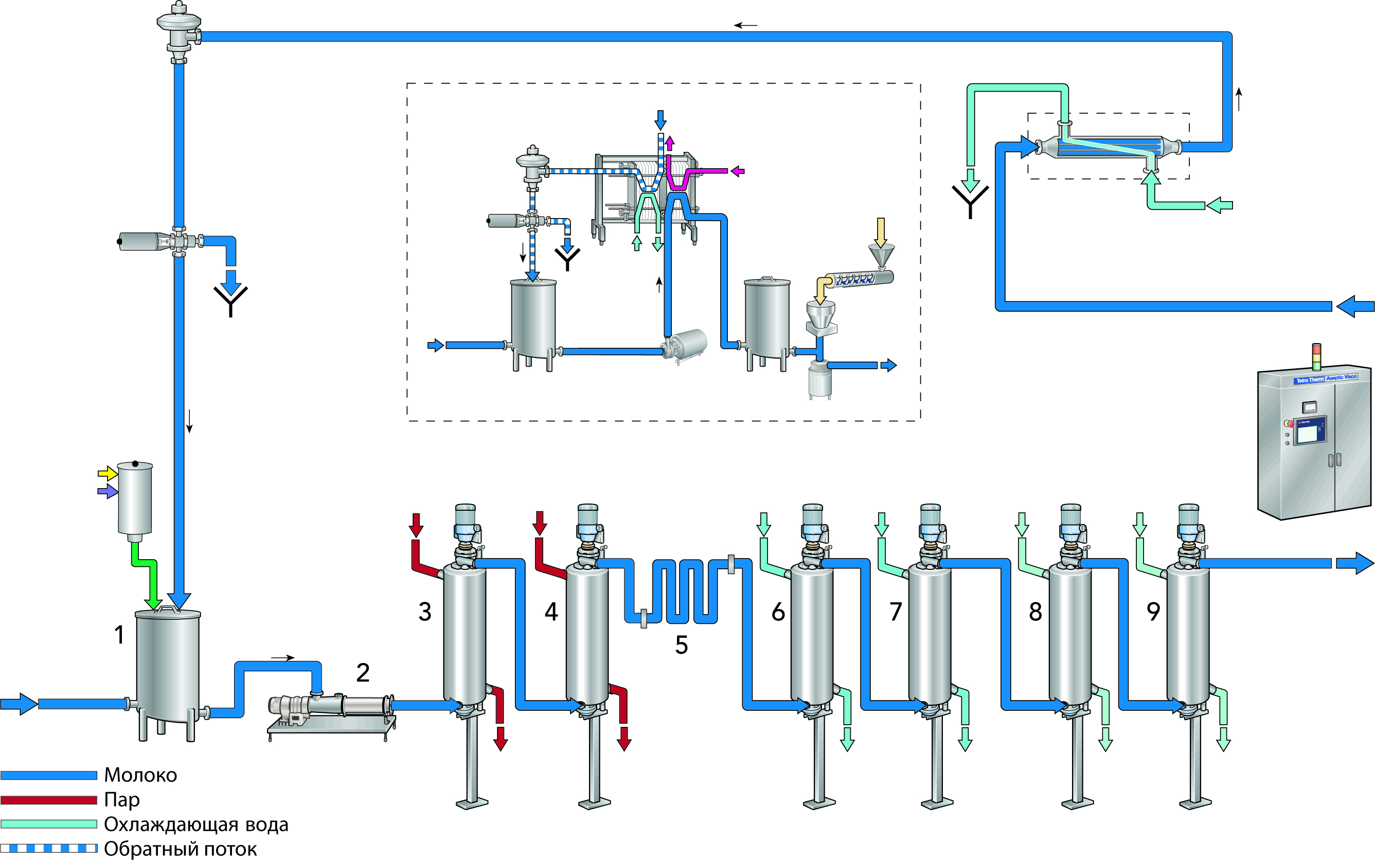 И наконец, охлажденный продукт закачивается в асептический танк (не показан), который обеспечивает буферный объем между линией непрерывного процесса и упаковочной системой.