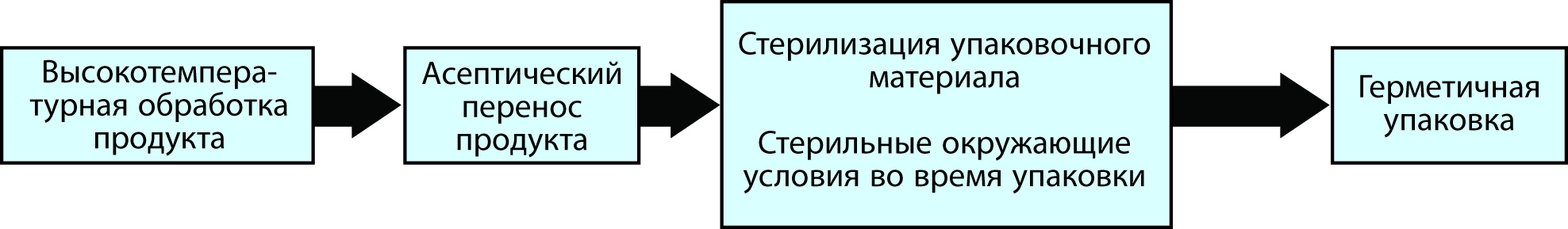 Асептическая упаковка была определена как процедура, состоящая из стерилизации упаковочного материала или тары, розлива коммерчески стерильного продукта в стерильных внешних условиях и производства достаточно плотной тары, чтобы предотвратить повторное бактериальное обсеменение, т. е. герметичной тары, рис. 9.26.