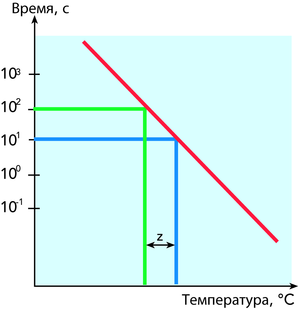 z = повышение температуры в °C, которое требуется, чтобы достичь такого же летального эффекта, при котором время воздействия уменьшается в 10 раз (например, 10,5 °C для спор Bacillus stearothermophilus)