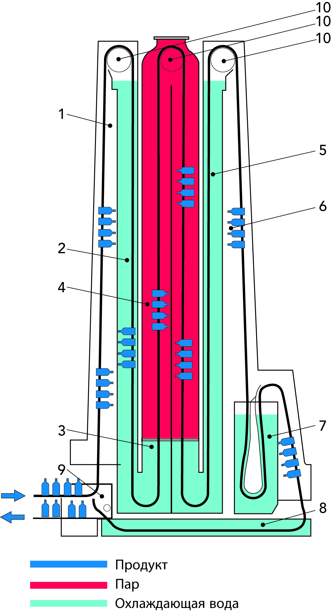 Труба выдержки (5) поддерживает продукт при требуемой температуре в течение требуемого промежутка времени. Продукт охлаждается водой (6 и 7) и циркуляционной охлажденной водой (8 и 9), пока не достигает упаковочной температуры.