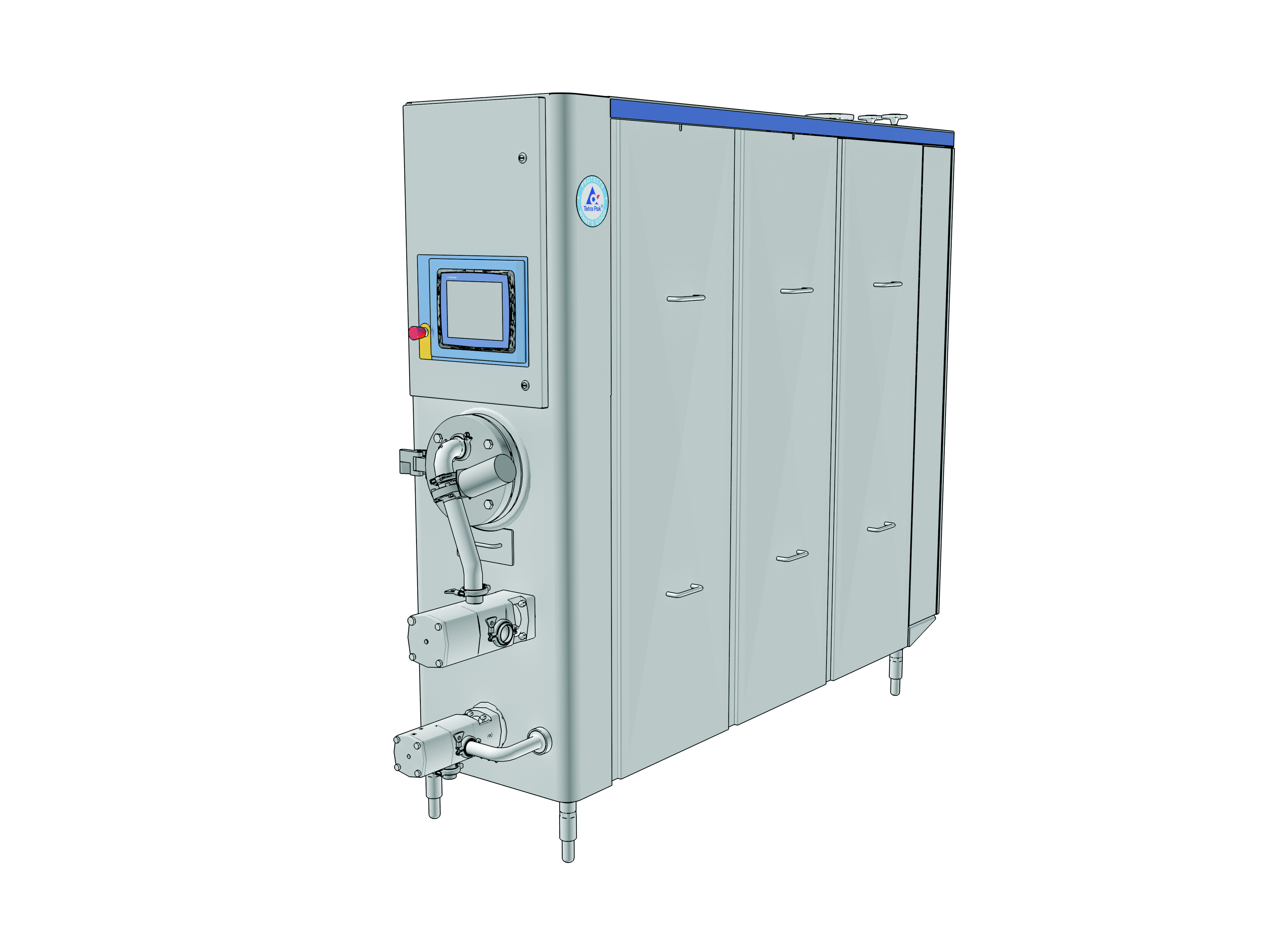Увеличение объема, вызванное внесением воздуха в смесь, называется взбитостью, и обычно составляет 80–100 %, что соответствует от 0,8 до 1 литра воздуха на 1 литр смеси. На рис. 19.4 показан вид спереди фризера вместе с (снизу вверх) смесительным насосом, насосом для мороженого и панелью управления.