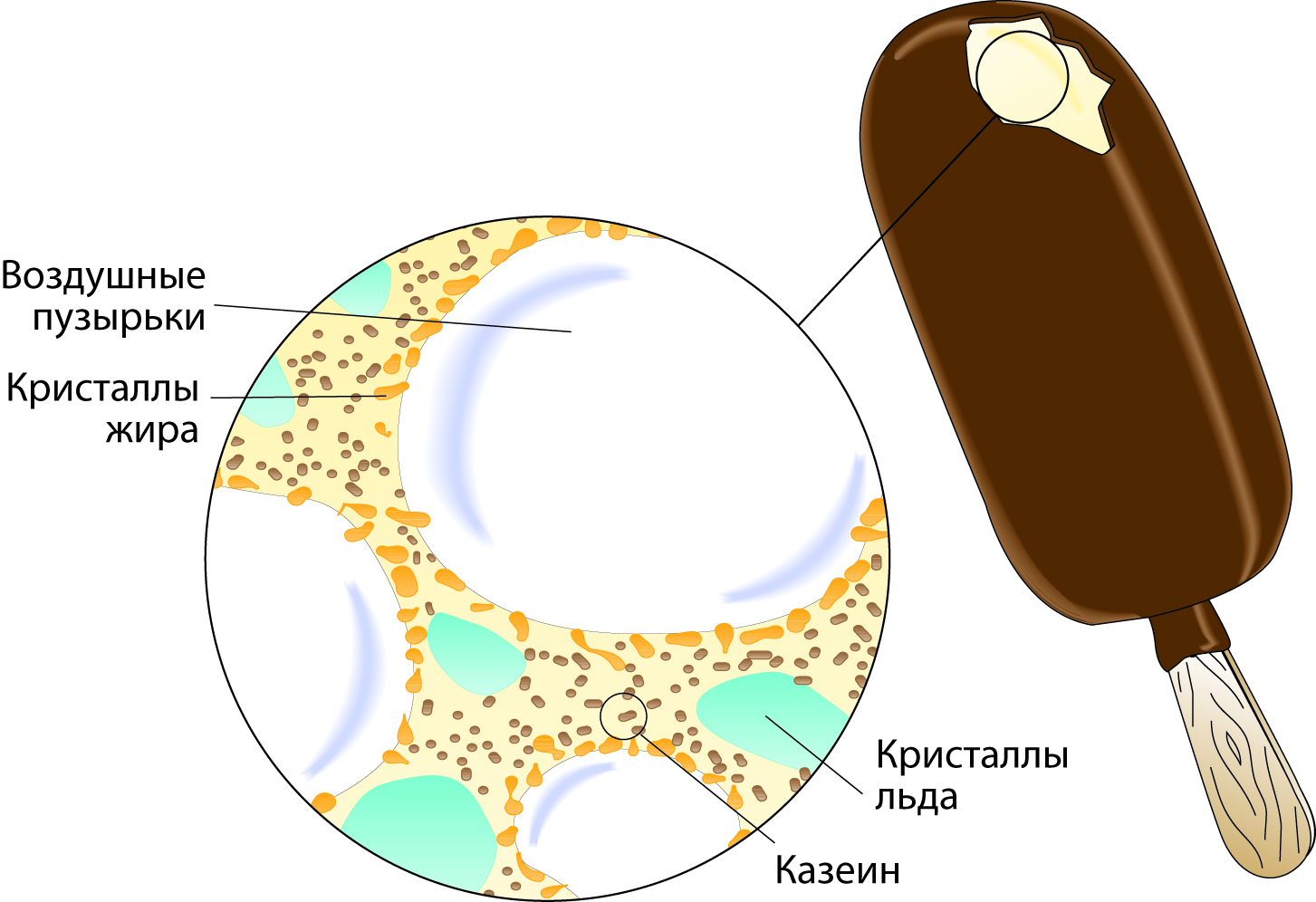 На рис. 19.5 показана текстура мороженого в брикете. Тут большие пузырьки воздуха покрыты кристаллизовавшимися шариками жира, которые поддерживают структуру воздушного пузырька. Незамерзшая фаза, окружающая пузырьки воздуха содержит концентрированную вымораживанием смесь сахаров, сухих веществ, содержащихся в молоке, и стабилизаторов. Эта незамерзшая фаза также содержит кристаллики льда.