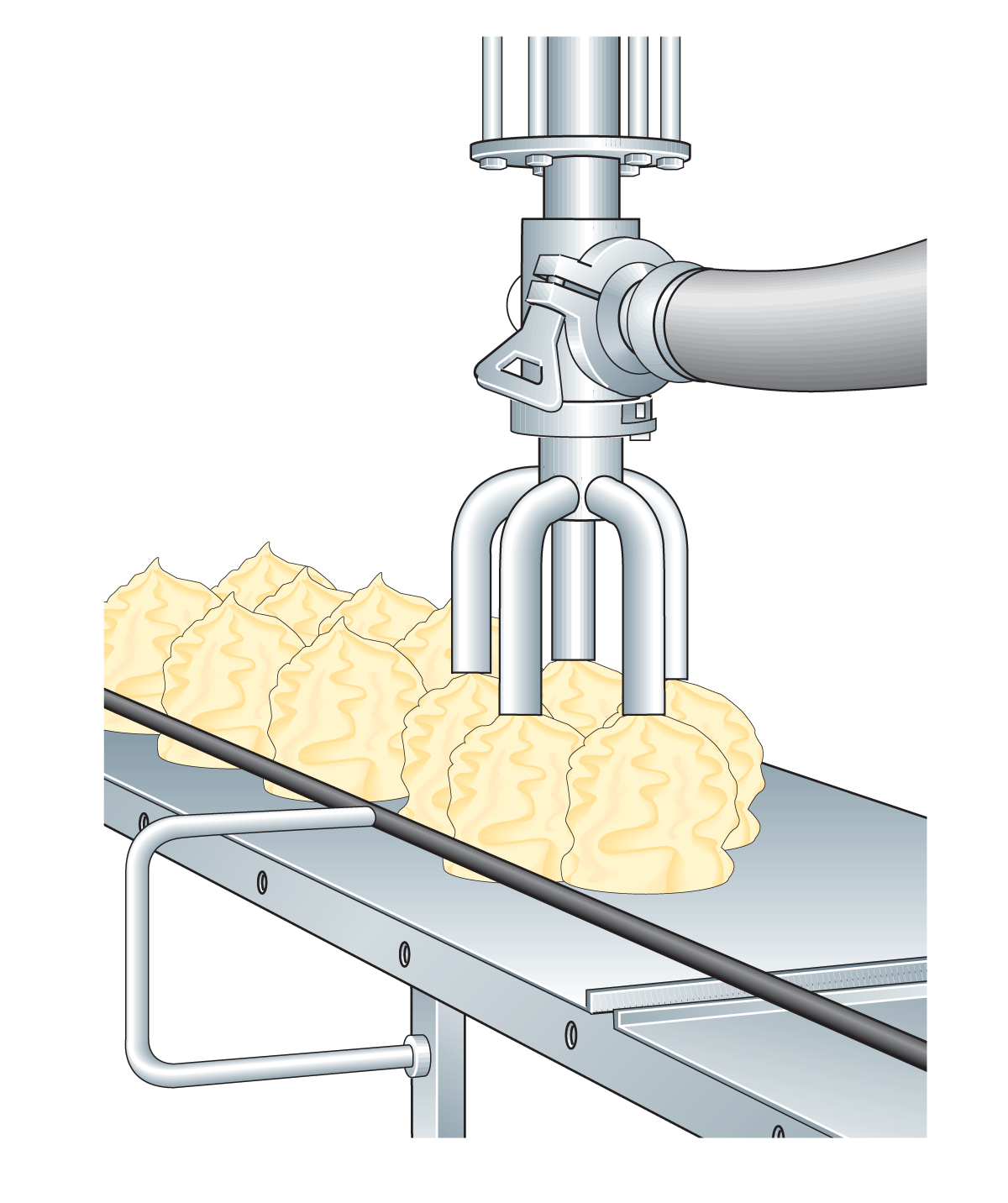 Базовые процессы в морозильном туннеле с лотками показаны в таблице 19.2. Экструдированное мороженое обычно изготавливают при помощи туннельного экструдерас лотками. Мороженое может выдавливаться непосредственно на лотки различной формы и размеров, в стаканчик или рожок, или в двойные вафли. Установка для экструзии для больших десертов показана на рис. 19.8.