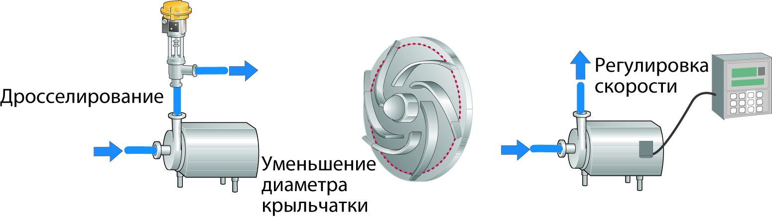 Редко удается подобрать такой насос, который бы абсолютно точно соответствовал требуемой производительности. Следовательно, необходимо произвести некую регулировку при помощи: