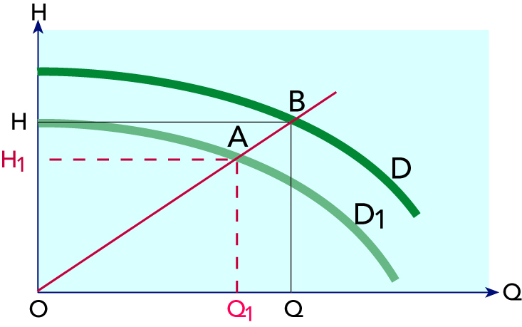 Самый экономичный вариант насоса получится, если диаметр его рабочего колеса будет уменьшен до значения D1. На большинстве графиков насосов нанесены кривые для различных диаметров рабочего колеса.