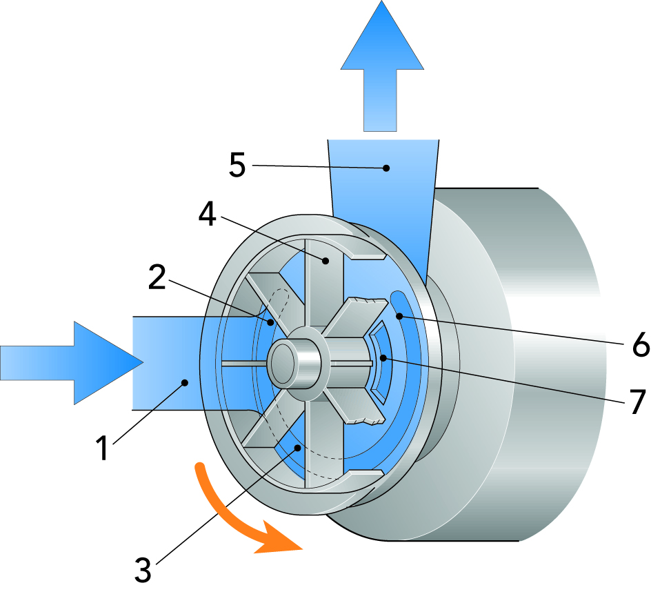 Насос состоит из рабочего колеса с прямыми радиальными лопастями (4), вращающимися в корпусе, впускного и выпускного отверстий и приводного двигателя. От впускного отверстия (1) жидкость поступает на лопасти, которые с ускорением направляют ее в корпус насоса, где она образует «жидкое кольцо», вращающееся практически с той же скоростью, что и рабочее колесо.