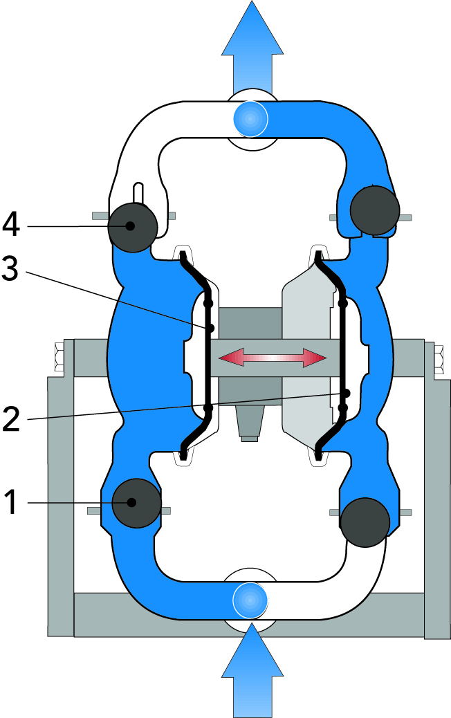 Обе диафрагмы соединены общим штоком, и поэтому всегда, когда в одной из камер происходит всасывание, из другой продукт выталкивается. Во время каждого цикла сжатый воздух выполняет две роли: производит выпуск продукта и прием очередной порции среды для перекачки.