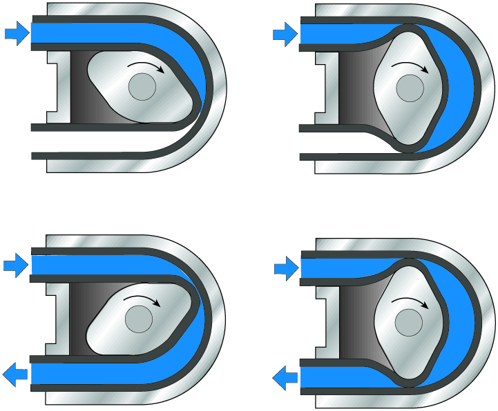 В заполненном смазкой корпусе насоса вращается ротор, который сдавливает шланг роликами. Участки всасывания и выпуска герметично отделены друг от друга.