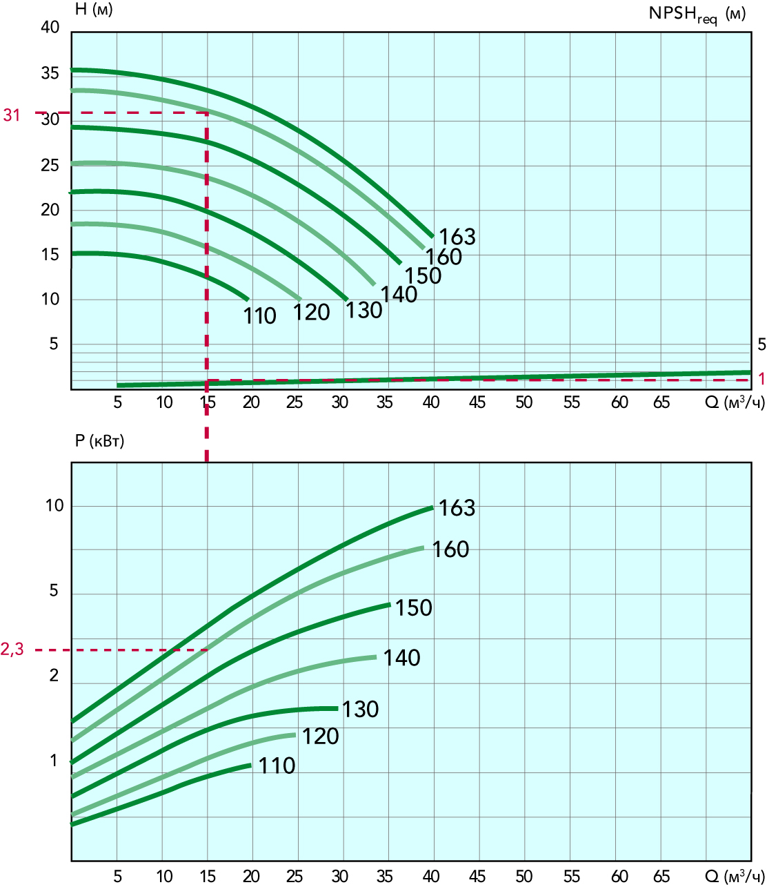 Эти графики построены на основе испытаний с использованием воды. Если насос планируется использовать для перекачки жидкостей с другими физическими свойствами, эти данные должны быть пересчитаны.