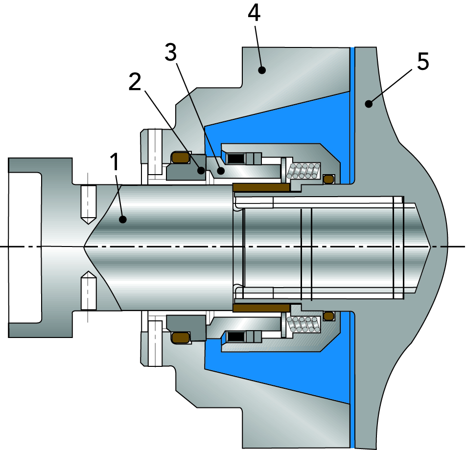 У вращающегося уплотнительного кольца имеется притертая уплотняющая поверхность, которая вращается относительно неподвижного притертого уплотнительного кольца. Между уплотняющими поверхностями образуется пленка жидкости. Эта пленка смазывает уплотнение и предотвращает непосредственный контакт между уплотнительными кольцами. А это означает минимальный износ и долгий срок службы уплотнения. Если насос работает вхолостую, жидкая смазывающая пленка исчезает и износ уплотнительных колец резко ускоряется.