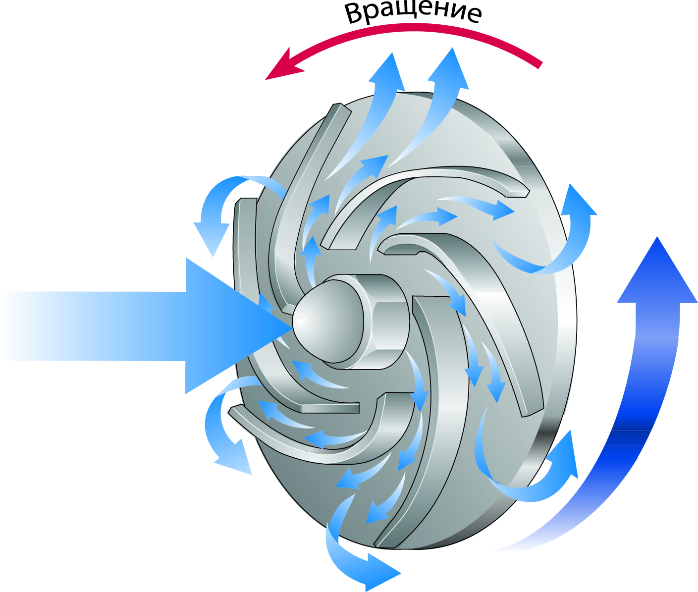Лопасти рабочего колеса образуют в насосе каналы. Обычно лопасти изогнуты в обратную сторону, но в маленьких насосах они бывают прямыми.