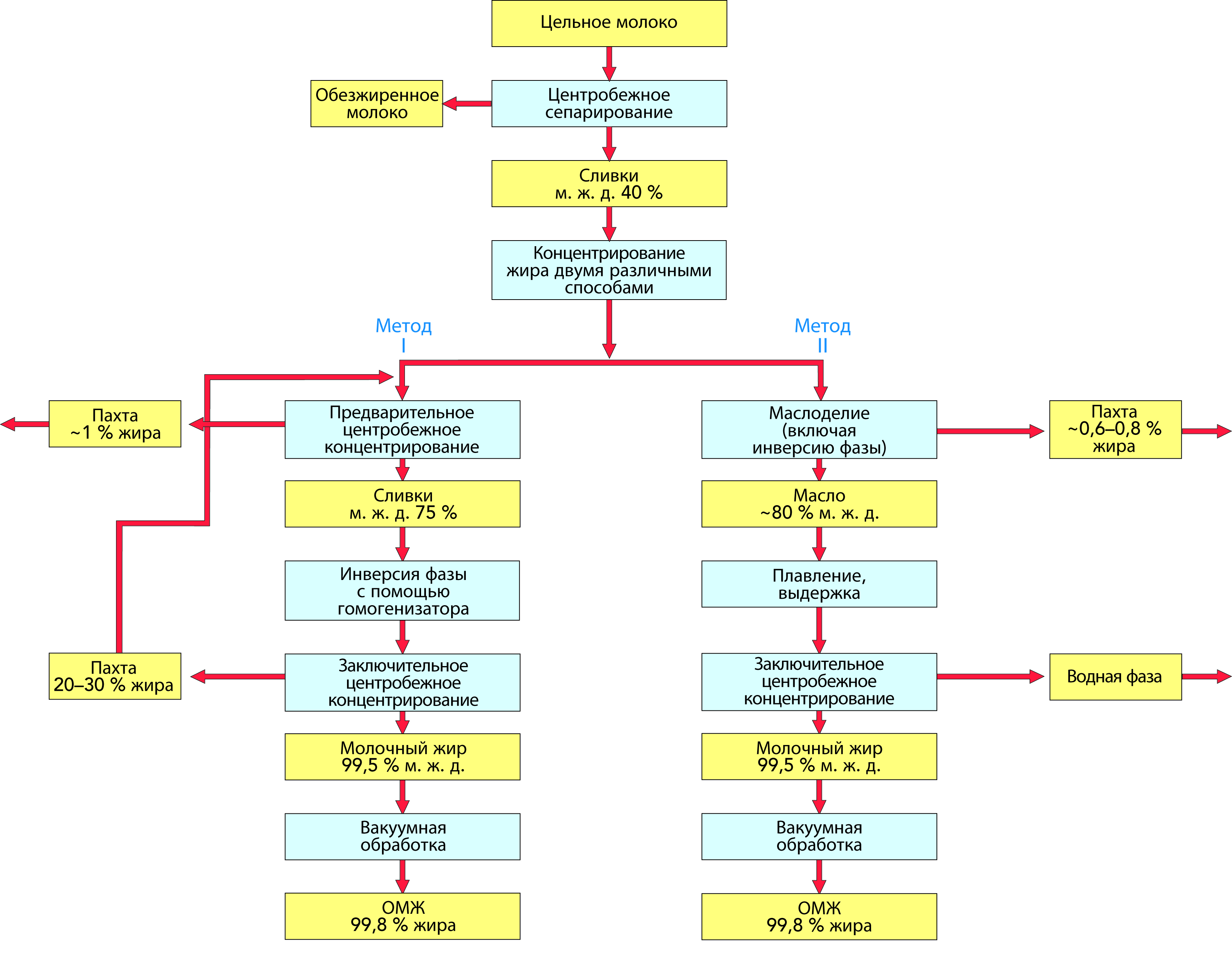 Производство ОМЖ, в принципе, осуществляется в соответствии с двумя методами: в непрерывном режиме непосредственно из сливок (молока) и через переработку масла. Эти два способа показаны на блок-схеме на рис. 13.1.