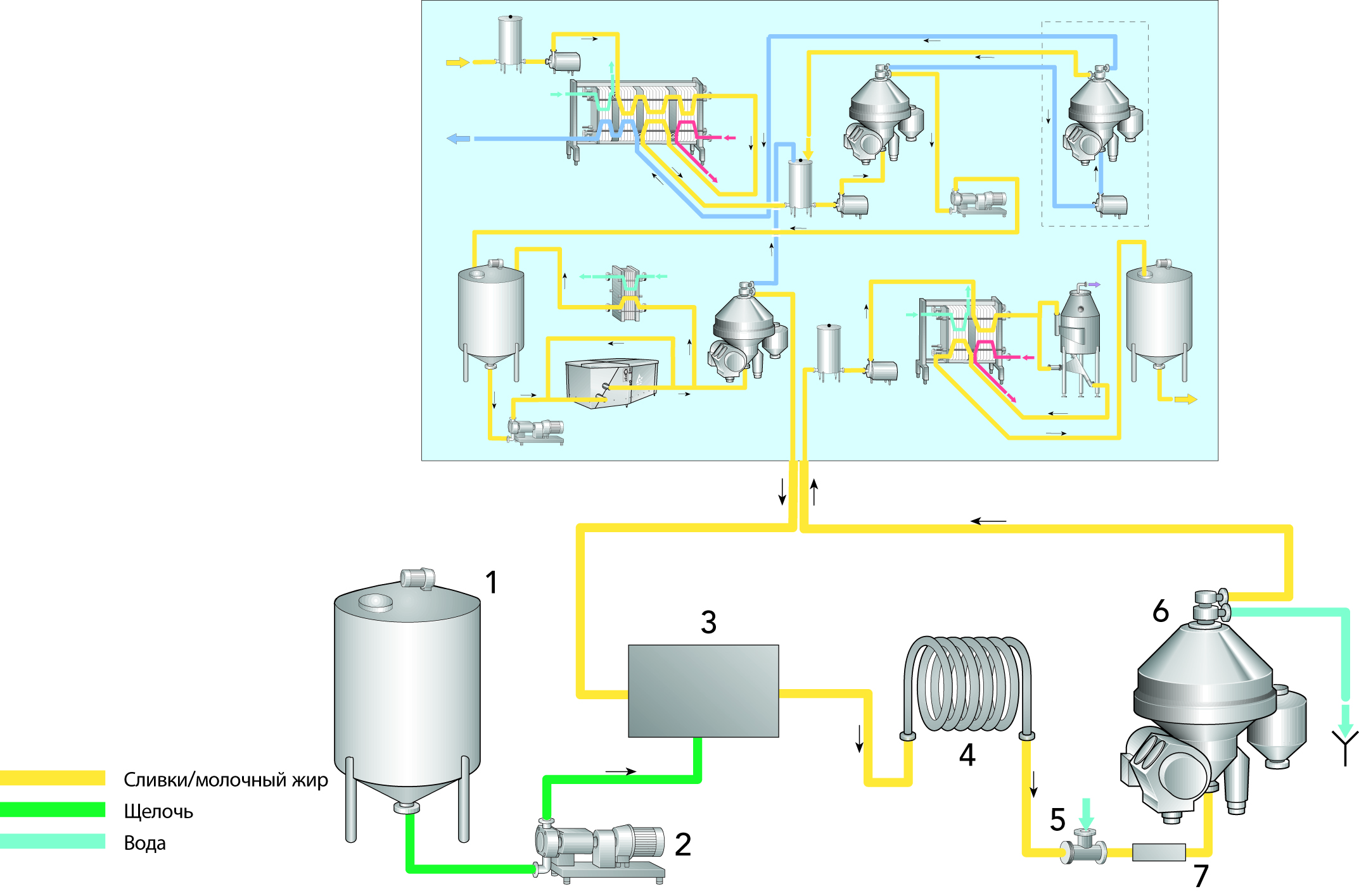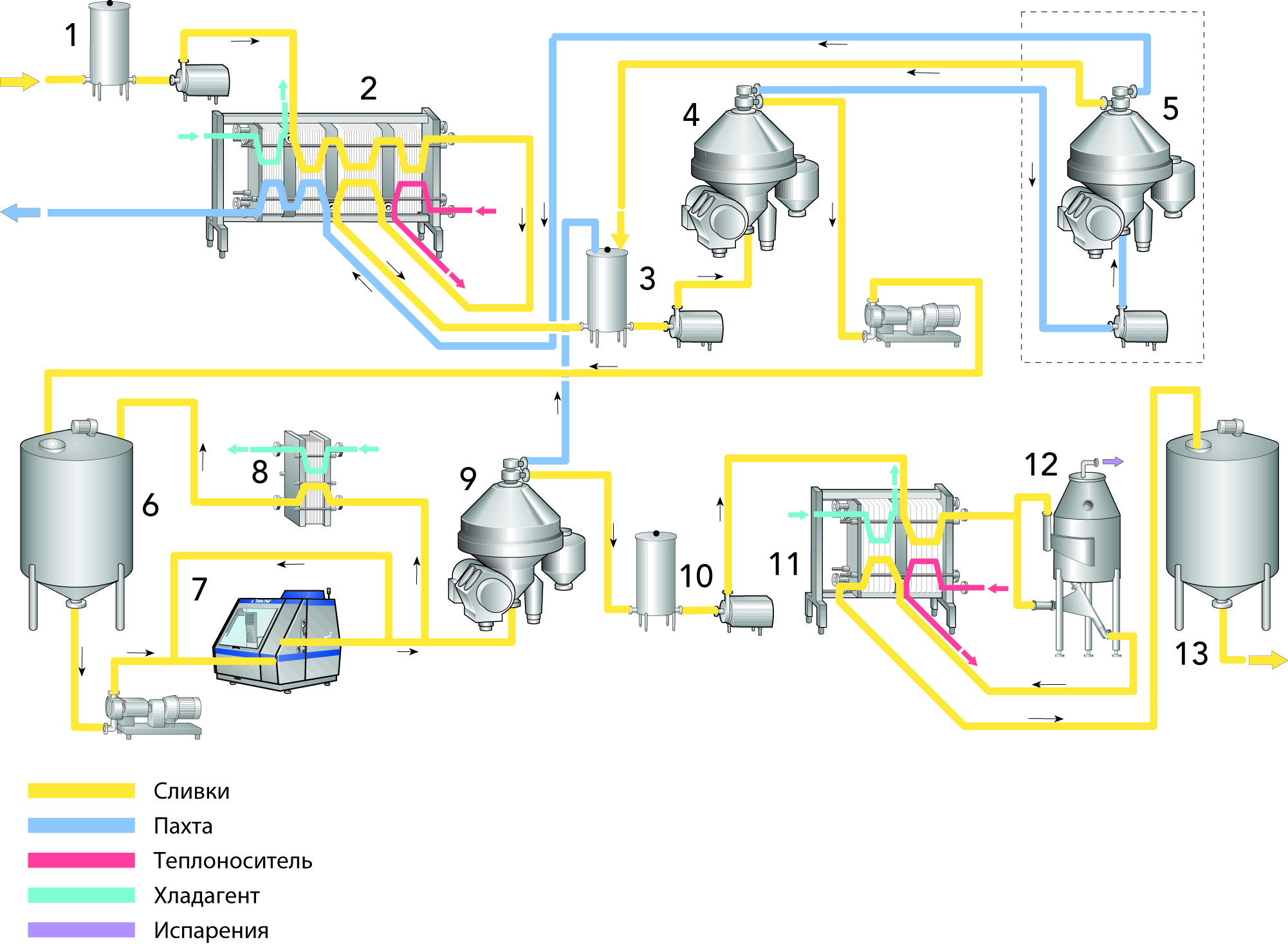 Пастеризованные или непастеризованные сливки с содержанием жира 35–40 % через балансный танк (1) поступают на установку для производства ОМЖ и направляются через пластинчатый теплообменник (2) для корректировки температуры или для пастеризации на сепаратор (4) для предварительного концентрирования жира до уровня приблизительно 75 %. Температура при предварительном концентрировании и далее до пластинчатого теплообменника (11) поддерживается на уровне приблизительно 60 °С. «Легкую» фазу собирают в танк для промежуточного хранения (6) в ожидании дальнейшей обработки, в то время как «тяжелую» фазу, обычно называемую пахтой, можно направить через сепаратор (5) для выделения жира, который затем будет перемешан с поступающими сливками (3). Обезжиренное молоко возвращается в пластинчатый теплообменник (2) для регенерации тепла и затем в танк для хранения.