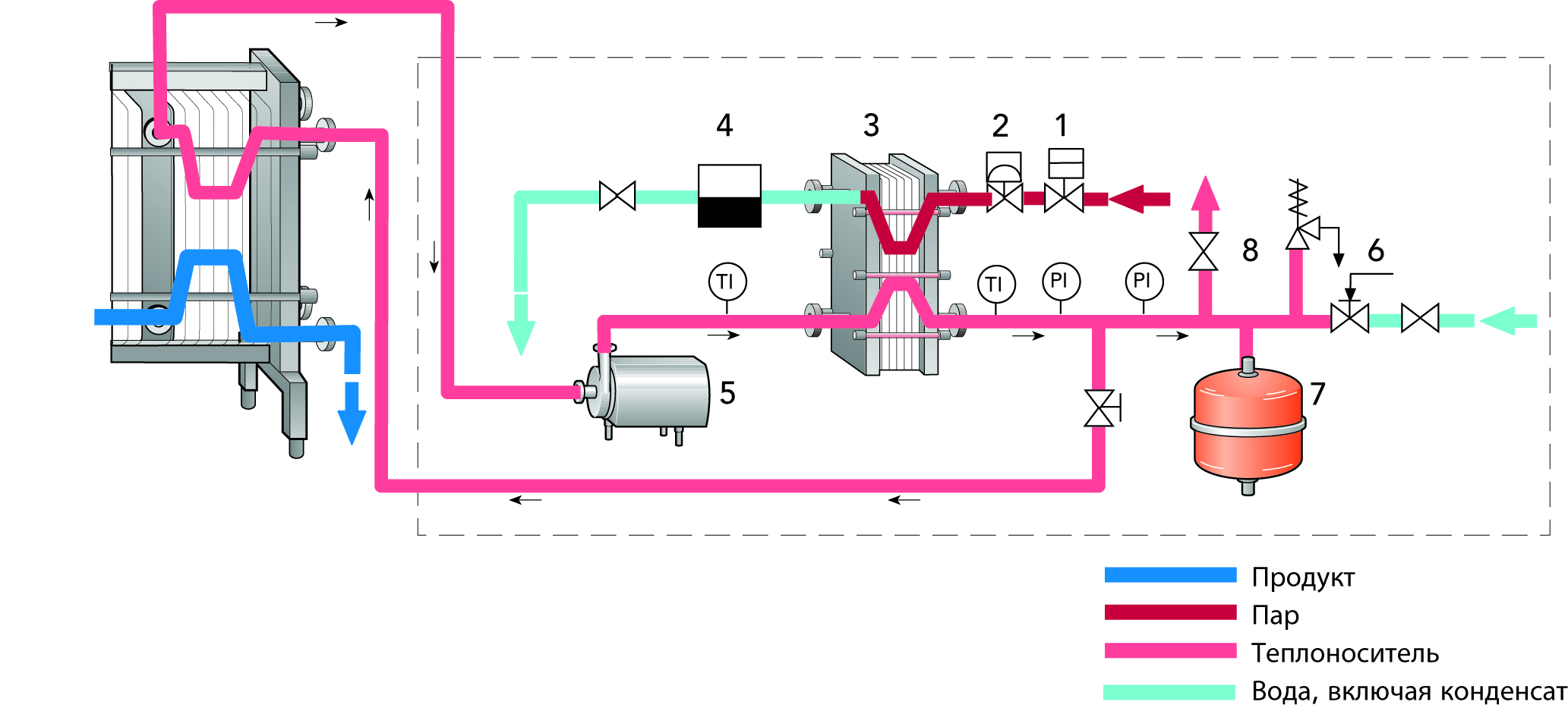 Пар подается из бойлера молочного завода под давлением 600–700 кПа (6–7 бар). Этот пар используется для нагрева воды, которая в свою очередь нагревает продукт до температуры пастеризации. Водонагреватель, представленный на рис. 7.2, является замкнутой системой, состоящей из специально спроектированного компактного и простого пластинчатого теплообменника батарейного типа (3), оборудованного парорегулирующим клапаном (2) и конденсационным горшком (4). Техническая вода циркулирует в системе с помощью центробежного насоса (5) через нагреватель (3) и нагревательную секцию пастеризатора. Функция сосуда-расширителя (7) состоит в компенсации увеличения объема воды, которое происходит при ее нагревании. Система включает также индикаторы температуры и давления и предохранительный и вентиляционный клапаны (8).