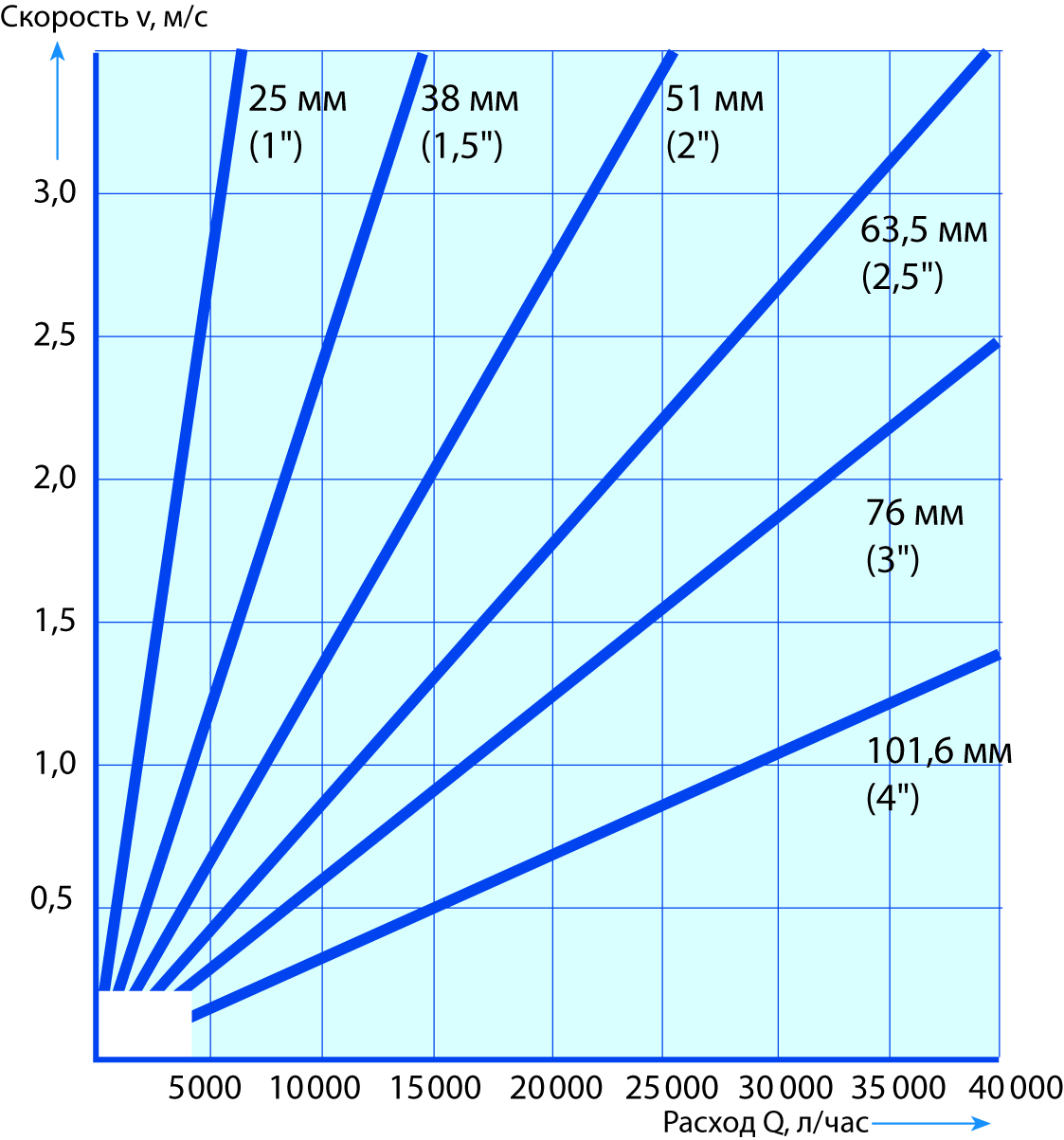 Для расхода 20 000 литров/час, размера трубы 2,5 дюйма (63,5 мм) и скорости 1,75 м/с график указывает падение давления, или снижение столба, на 0,4 м при полностью открытом клапане.