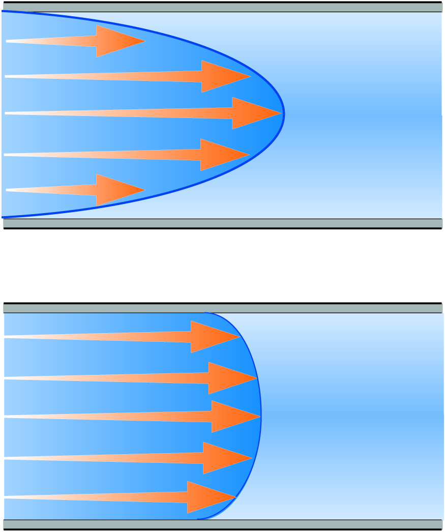 В турбулентном потоке слои перемешиваются, и, следовательно, скорость жидкости примерно одинакова в центральной части потока, но быстро падает по направлению к стенкам. У стенок очень тонкий ламинарный поток жидкости имеет нулевую мгновенную скорость.
